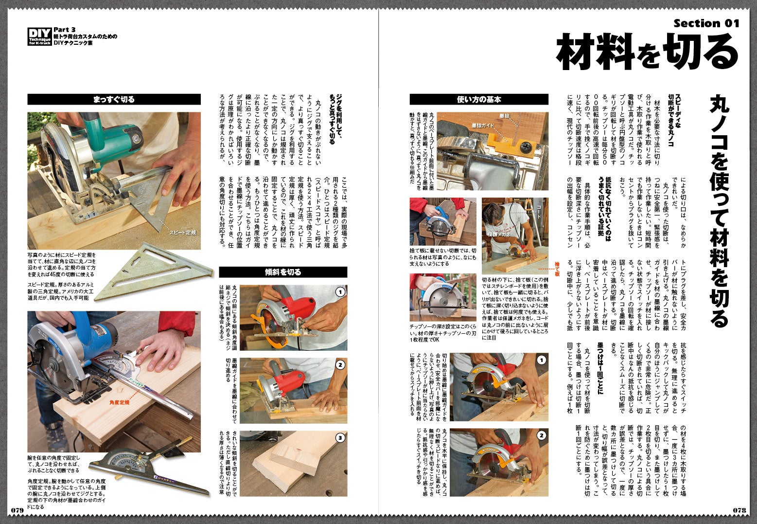荷台をカスタムするために必要なDIYテクニックをわかりやすく解説。木材を切ったり、部材を繋ぐのに使用する丸ノコやインパクトドライバーといった電動工具の使い方を写真入りで紹介していきます。