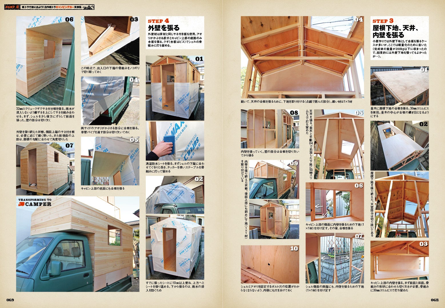 編集部がDIYで軽トラの荷台に木製のキャンパーを製作した過程を10ページにわたって詳細にリポート。「小屋」をコンセプトに、ホームセンターで買う事のできる材料を使って日曜大工感覚で製作にトライしました。使用木材、材料、工具の一覧に加え、骨組み図も掲載しています。