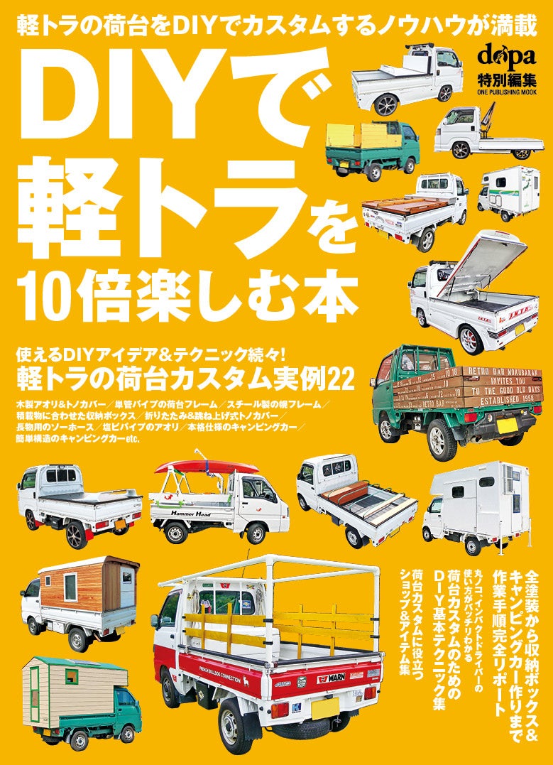 株式会社ワン・パブリッシング(東京都台東区/代表取締役:廣瀬有二)は、2023年11月28日(火)に「DIYで軽トラを10倍楽しむ本」(定価:1,870円(税込))を発売いたしました。 なんでも運べるユーティリティ性と取り回しの良い絶妙なサイズ。さらに税金や保険料などの維持費も安いため、「一度使ったら手放せない」とオーナーが口を揃える軽トラック。そんな”愛すべき軽トラ”を自分仕様にカスタマイズして楽しむためのアイデアの数々を紹介。全国の軽トラオーナーが自身でカスタマイズを手掛けた荷台カバーや自作キャンピングカーなど、DIYでカスタムするためのノウハウを写真入りで詳しく解説していきます。
