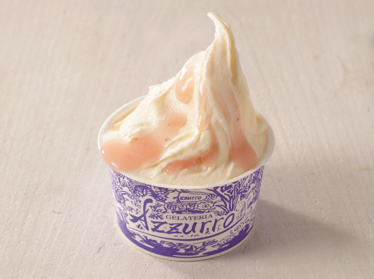 滋賀県産苺を使用したソースをかけたバニラジェラート。