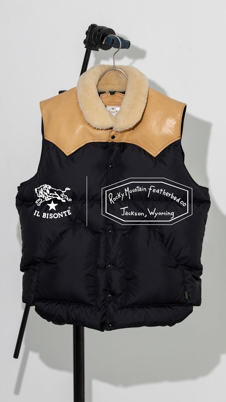 本コラボレーションには、一枚裁ちのヨークレザーと襟の天然ムートンが特徴のRocky Mountain Featherbedオリジナルアイテム「Christy Vest(クリスティーベスト)」を採用。