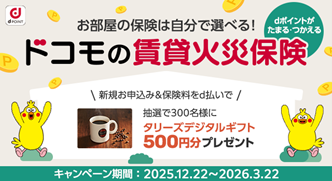 期間中に、「ドコモの賃貸火災保険」を新規でお申込いただき、「d払い」で保険料をお支払いされたお客さまの中から抽選で300名さまに、タリーズで使えるデジタルギフト500円分を進呈します。 |