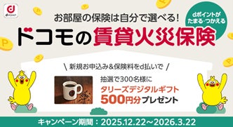 ドコモは、本保険の累計販売件数が5,000件を突破したことを記念して、タリーズで使える500円分のデジタルギフトが当たる「ドコモの賃貸火災保険 5,000件突破記念キャンペーン※5」を2025年12月22日(月)から2026年3月22日(日)まで開催します。