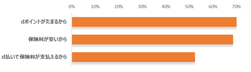 年間の保険料は3,500円からで、ご契約者アンケート※2では68.5%のお客さまが「保険料の安さ」を加入の決め手として挙げています。また、本保険に切り替えることで年間平均6,247円※3の保険料を節約できていることがわかりました。加えて、保険料に対して最大2.0%のdポイントがたまる点や※4、保険料のお支払いに「d払い®」をご利用いただける点も、多くのお客さまに高く評価いただいております。