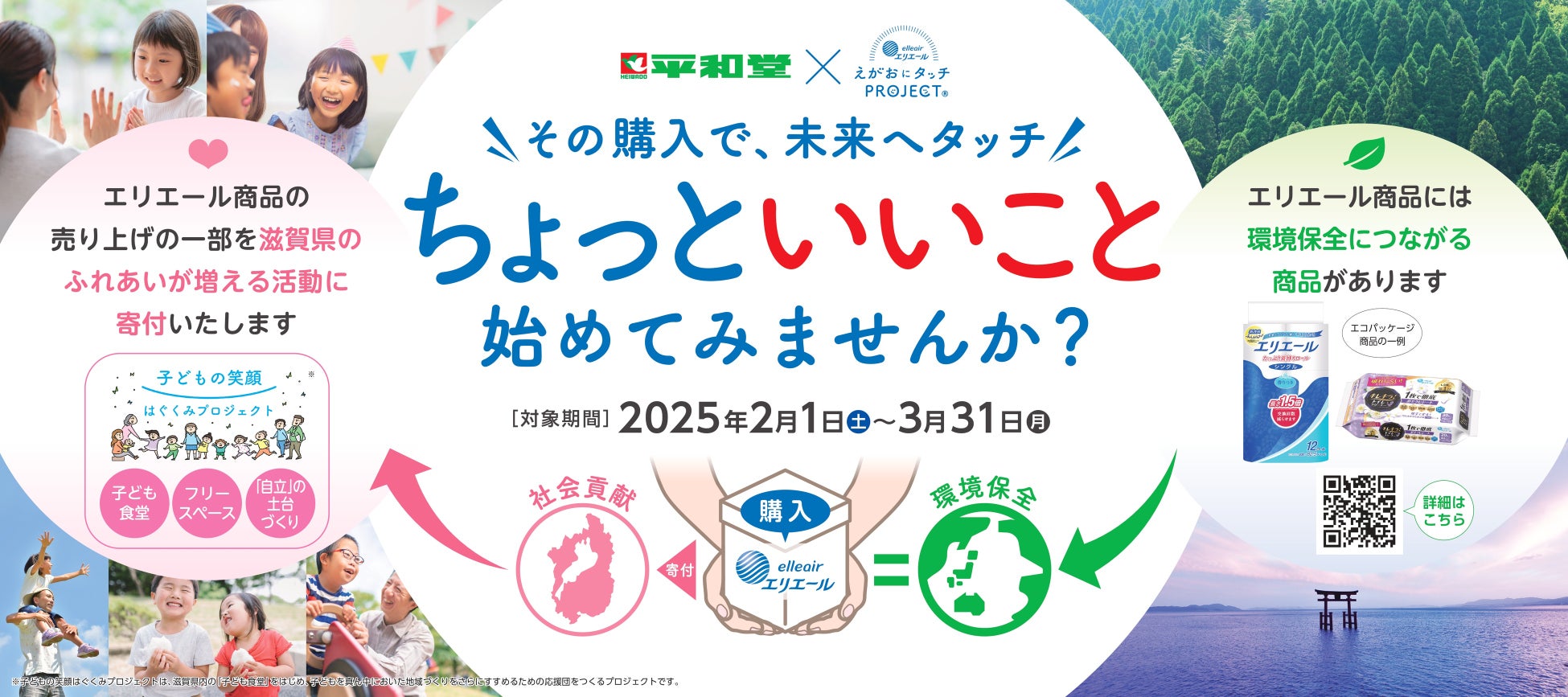 「エリエール えがおにタッチ PROJECT」に賛同いただいた平和堂と協同で、2025 年 2 月 1 日(土)~3 月 31 日(月)に第3弾となる「ちょっといいことキャンペーン」を実施しました。期間中に平和堂グループの対象店舗にてエリエールブランドの商品をお買い上げいただくと、売り上げの一部が「子どもの笑顔はぐくみプロジェクト」に寄付されるキャンペーンです。