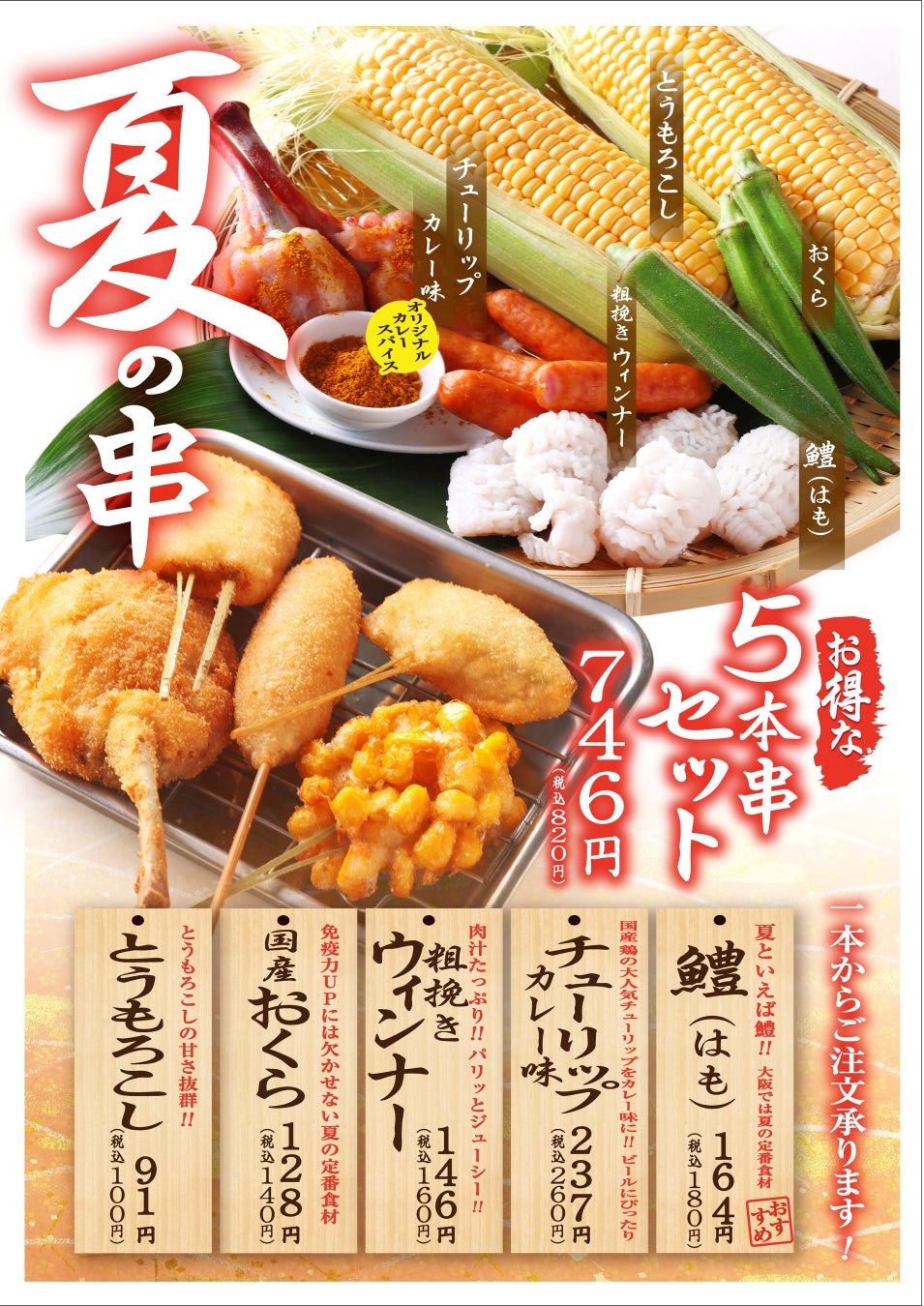 セット内容:夏の季節串『鱧』、『チューリップ カレー味』、『粗挽きウィンナー』、『おくら』に、旬を迎える『とうもろこし』を加えた、全5種の串をお得に味わえるセットです。