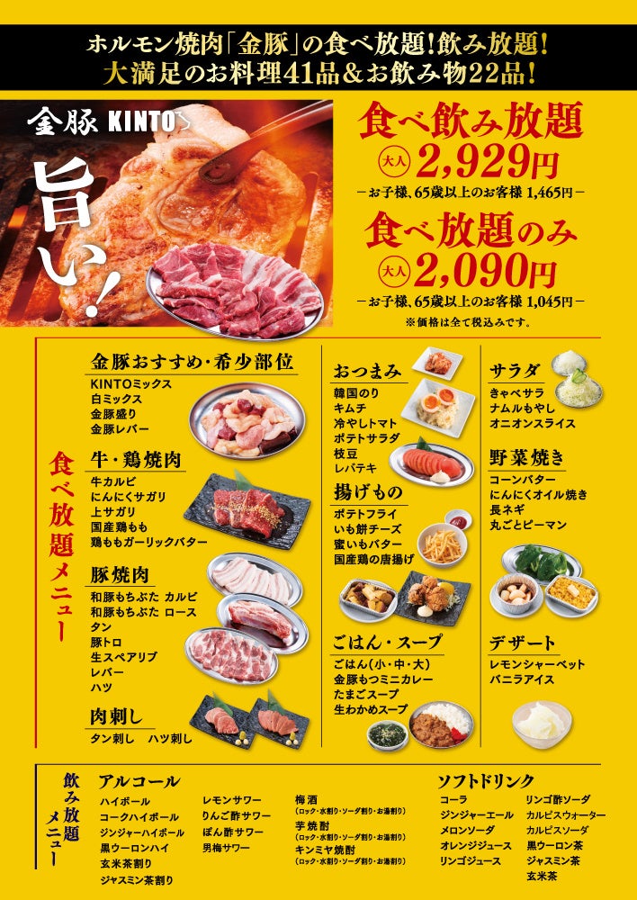 今回、肉の日イベントでは初となる【食べ飲み放題 2,929円(税込)】を実施!新鮮な豚肉や銘柄豚を思う存分お楽しみいただける内容となっており、さらには牛や鶏肉・一品料理やおつまみの計41品、飲み物はアルコール・ソフトドリンクを含めた計22品をご用意いたしました!2月9日(木)より3日間限定の開催となっておりますので、この機会に是非、ホルモン・焼肉「金豚 新子安店」へお越しください!