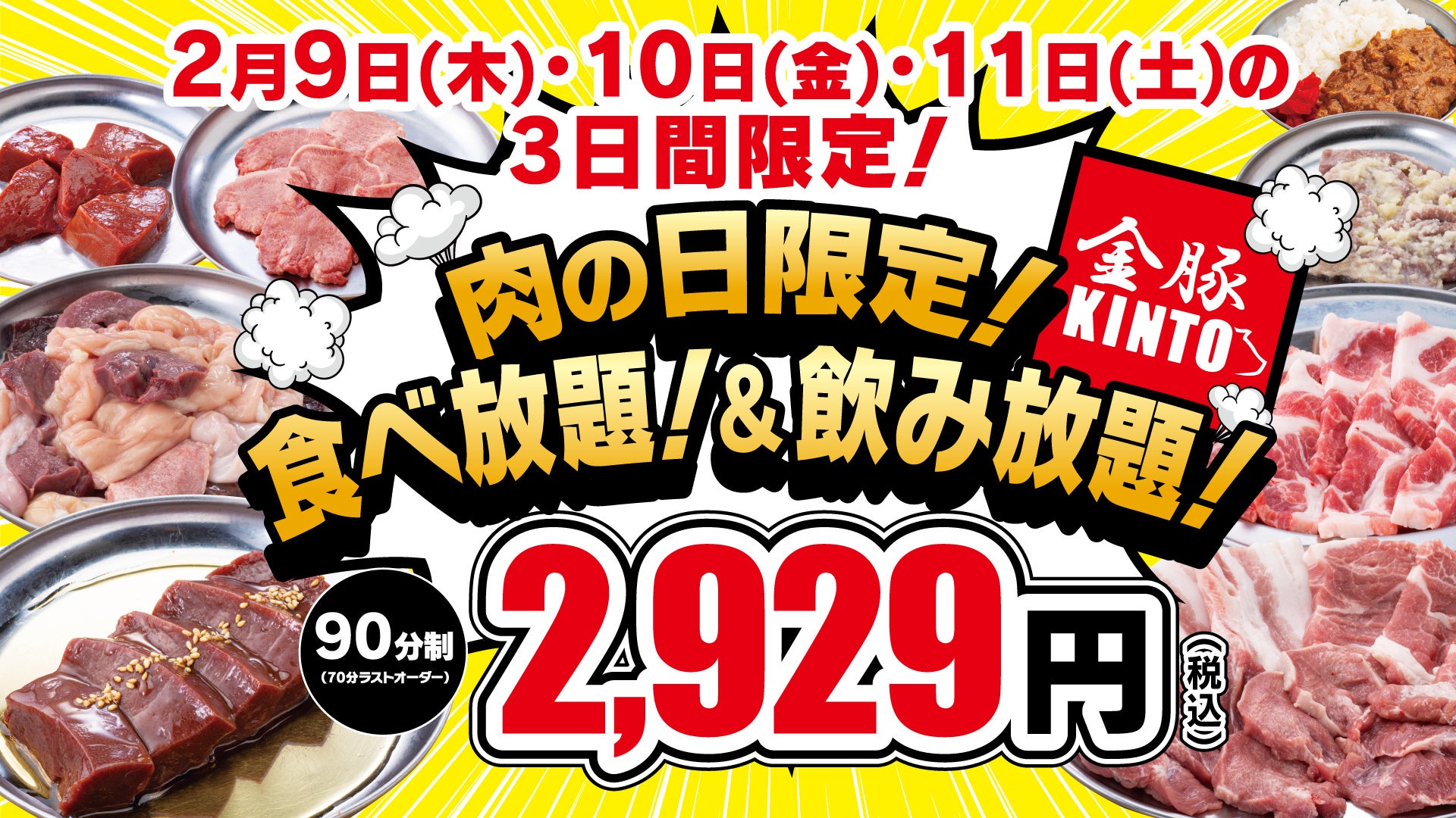 【焼肉食べ飲み放題2,929円(税込)】ホルモン・焼肉「金豚 新子安店」にて、2月9日(木)より3日間限定で『肉の日イベント』を開催!