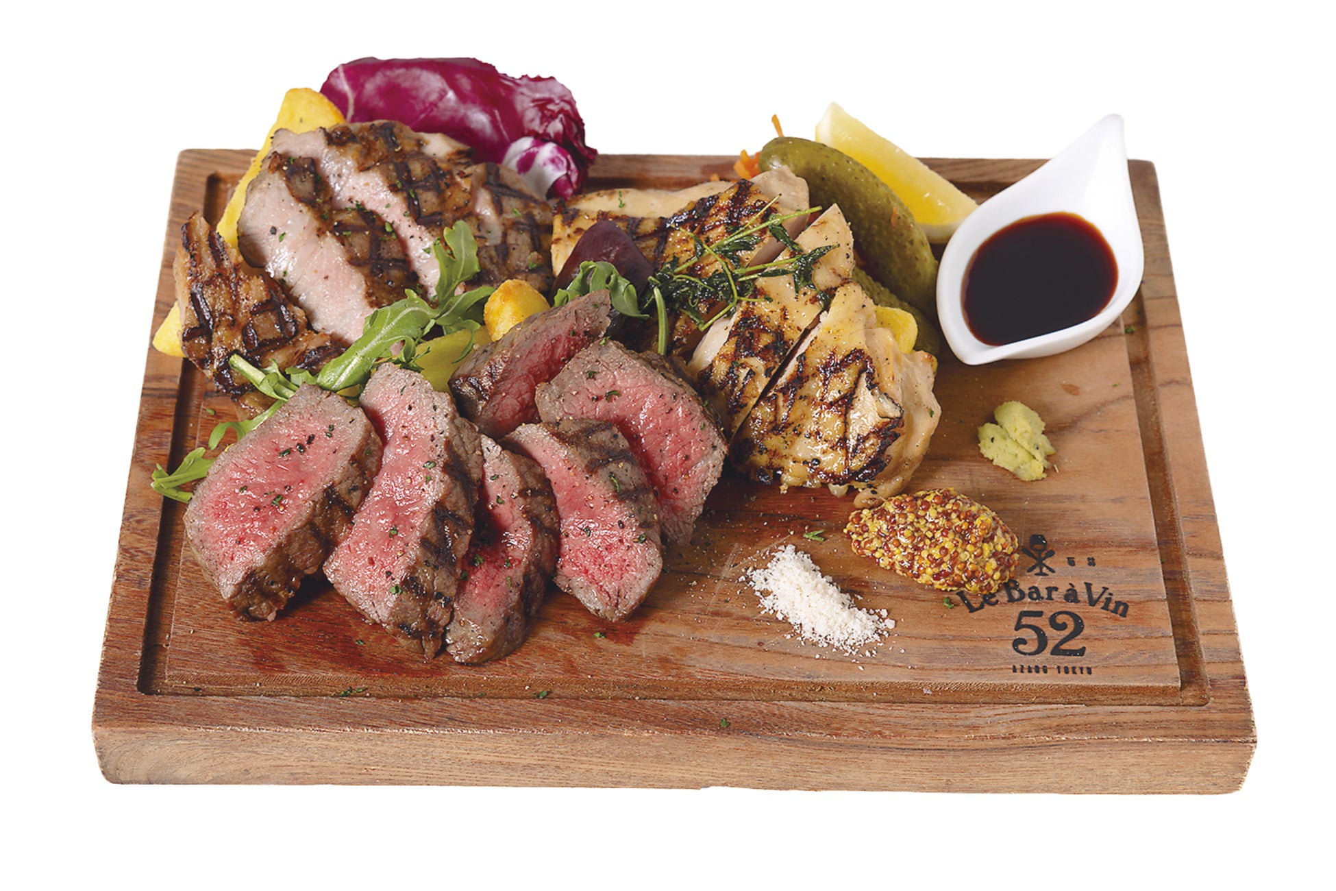 九州産銘柄A4ランク黒毛和牛とスペイン産イベリコ豚、宮崎産日南鶏のグリル3種盛り合わせ 4,059円(税込)