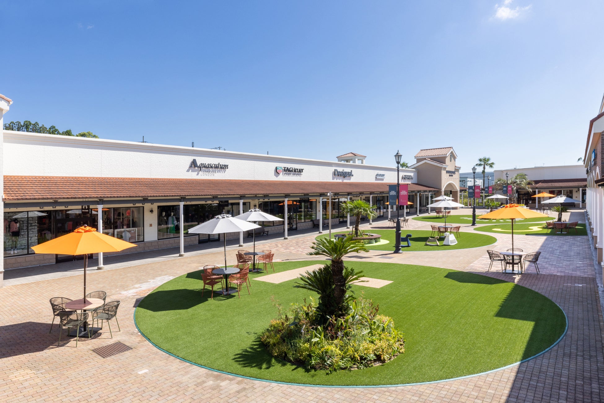 国内外の人気ブランド約 170 店舗が揃う九州を代表するショッピングリゾートです。アメリカ・カリフォルニア州南部の街並みをイメージし、そびえ立つヤシの木に、白壁や暖色系の屋根瓦、タイル模様が美しい施設で、一日中アウトレットショッピングをお楽しみいただけます。近隣には豊富な湯量を誇る温泉や、太宰府天満宮や吉野ヶ里遺跡など、観光も楽しめる魅力あふれるエリアです。