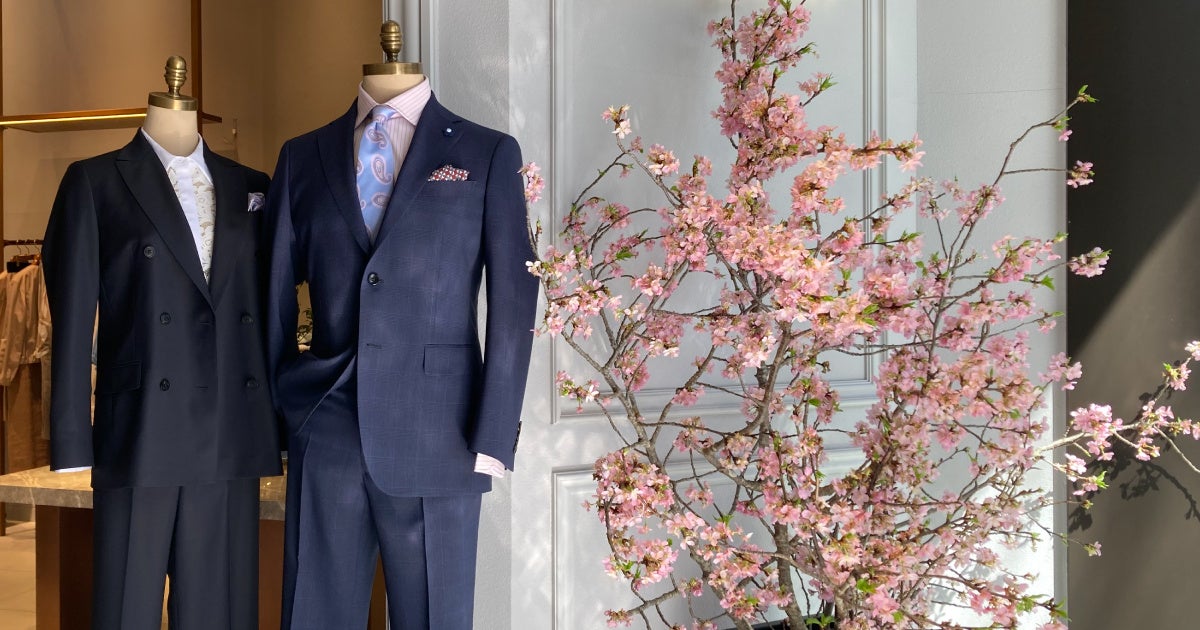 ネイビーベースの上品なグレナカートチェック柄(通称:グレンチェック柄)のオーセンティックでラグジュアリーなスーツです。肩パッドを省き軽量な胸増芯と裄綿を使った背抜き仕立てを採用し、快適な着心地を実現しました。服地は英国「ドーメル」社製の軽やかな「トニックウール」を使用。厳しい管理体制により生産されるパタゴニアウールを使用したトレーサブルな服地です。ジャケットには桜モチーフのブトニエールが添えられています。