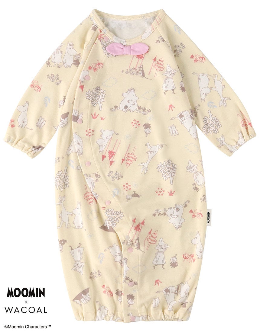自然あふれる森の中でムーミンや仲間たちが集う、愛らしくやさしいプリント柄のベビーパジャマです。同時に発売する[マタニティパジャマ]と同柄のため、ママとのおそろいコーディネイトが楽しめます。