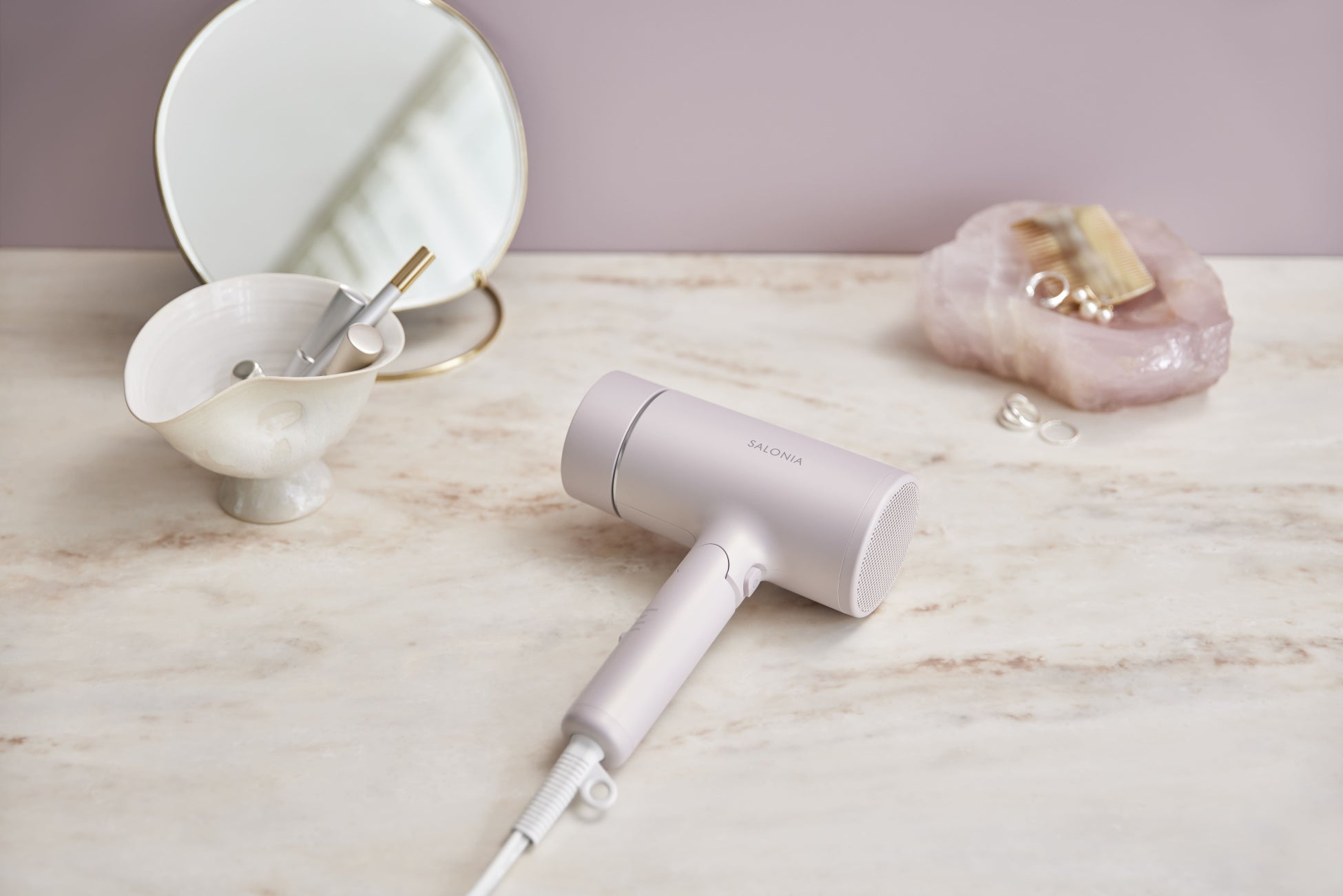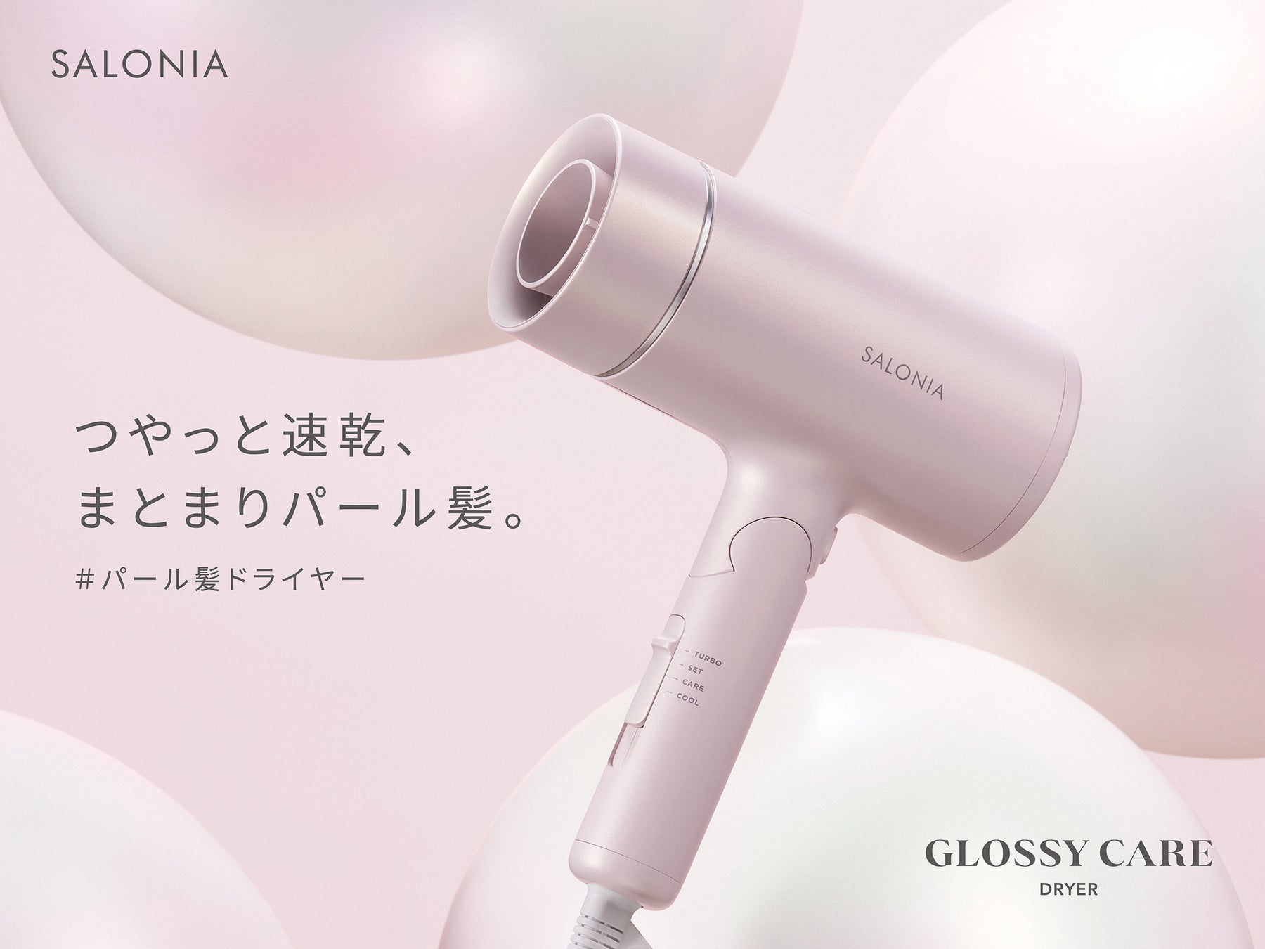 SALONIA「グロッシーケアドライヤー」夏のダメージ髪にうるおいを パール髪ノズル × マイナスイオン × 低温風で、つやっとまとまるパール髪へ ダメージを軽減*しながら、速乾ドライ