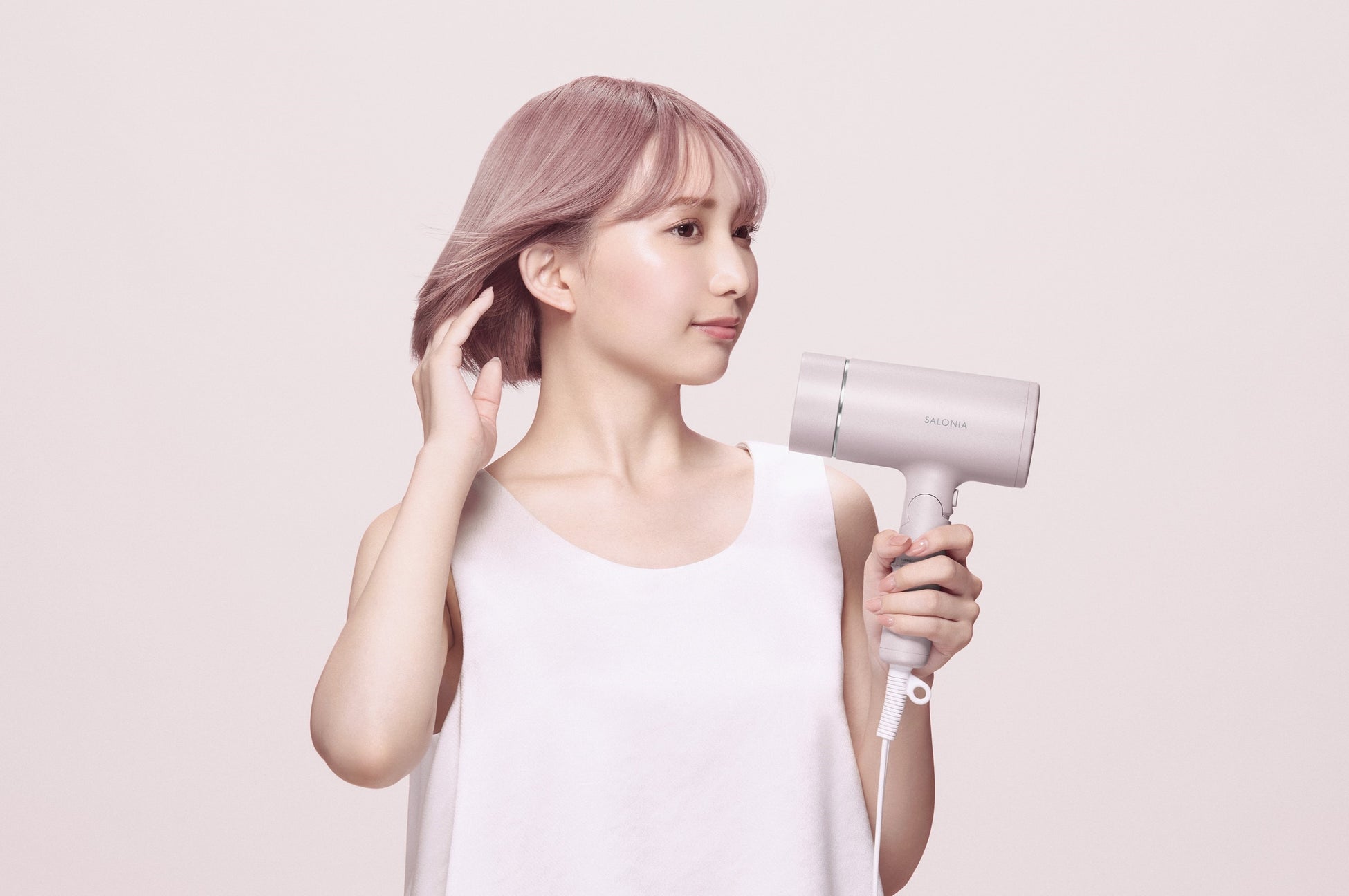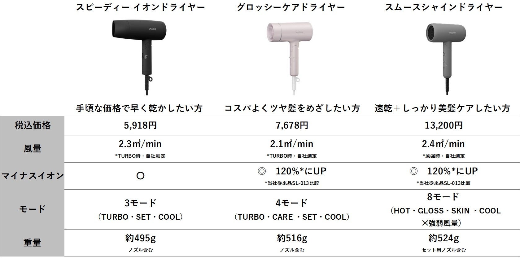 SALONIAのヘアドライヤーシリーズの累計販売台数は350万台を突破*1し、高品質でありながらコストパフォーマンスの高さやミニマルなデザインに対して好評をいただいています。ヘアドライヤーシリーズとして「スピーディーイオンドライヤー」(税込5,918円)と「スムースシャインドライヤー」(税込13,200円)を展開しており、新商品として「グロッシーケアドライヤー」(税込7,678円)を発売します。