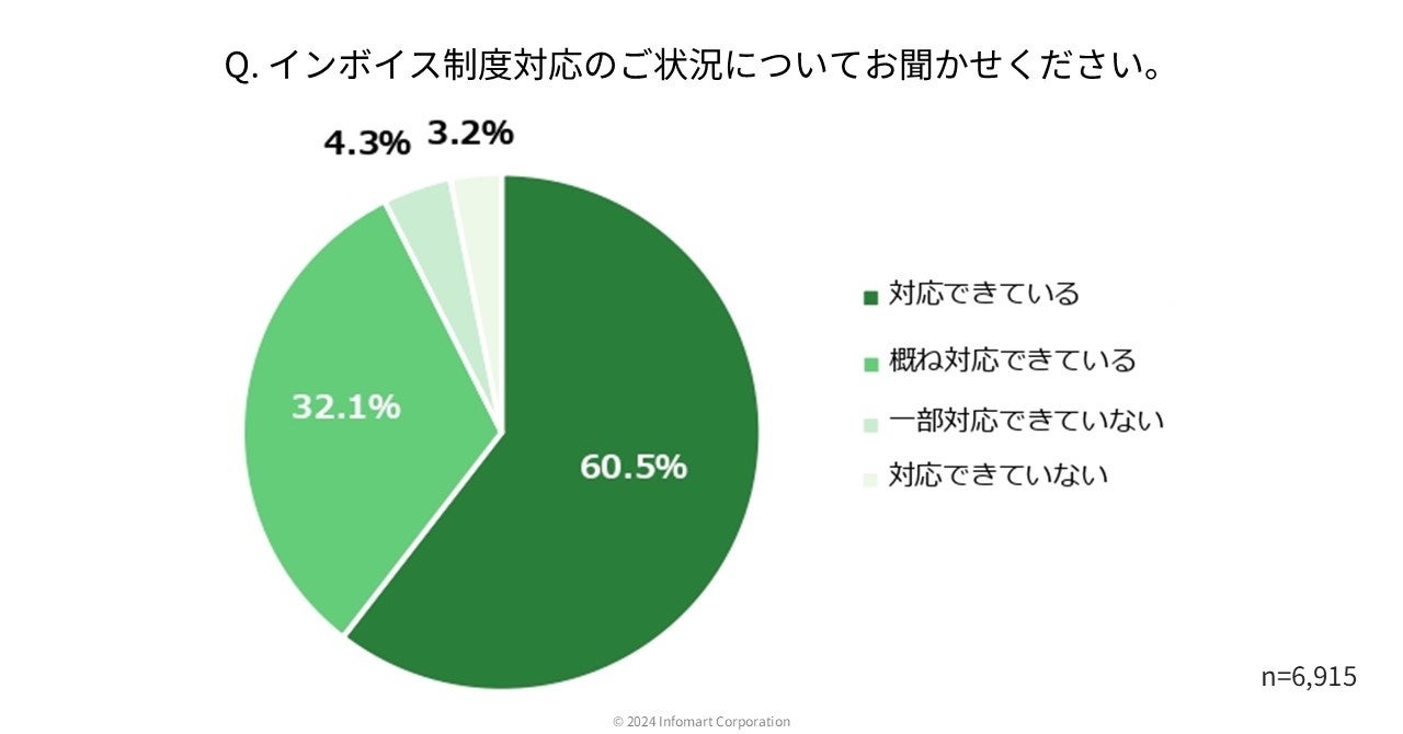 2023年10月に開始されたインボイス制度への対応状況を聞いたところ(n=6,915)、「対応できている」と回答した割合は60.5%でした。「概ね対応できている」との回答と合わせると9割を超え、多くの企業で対応が進んだことが分かりました。