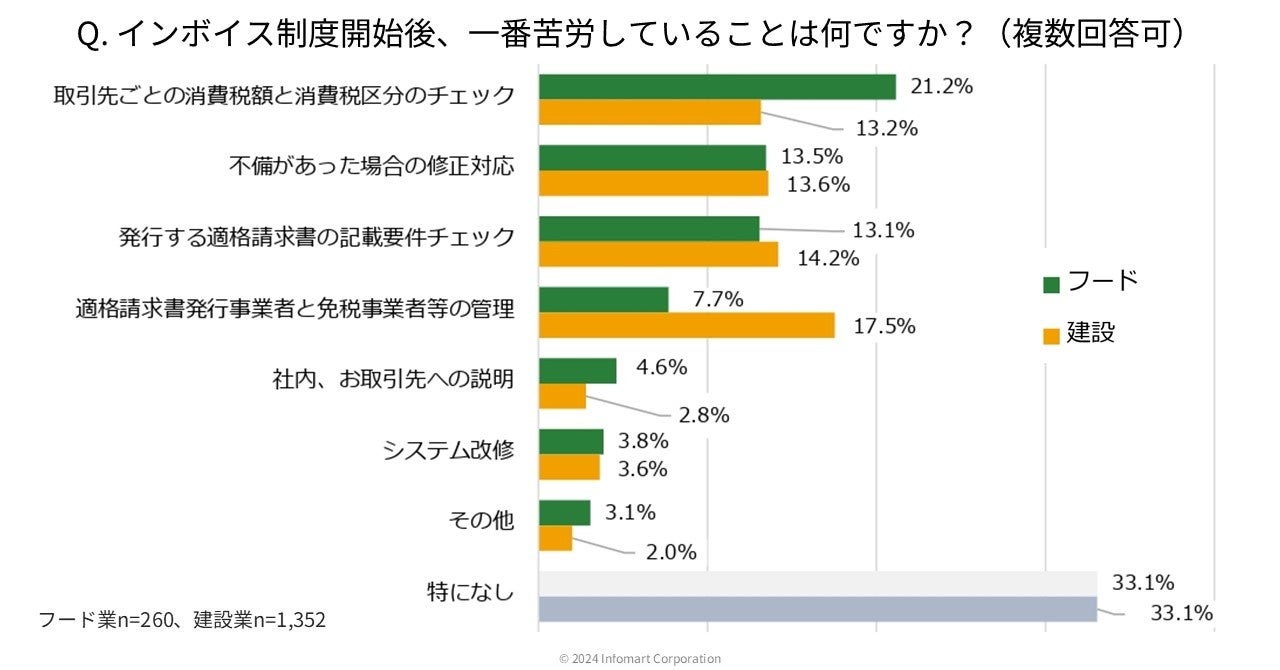 紙でのやり取りが多いフード業界と建設業界に絞って、一番苦労していることを聞いたところ(フード業n=260、建設業n=1,352)、フード業界では「取引先ごとの消費税額と消費税区分のチェック」が21.2%、建設業では「適格請求書発行事業者と免税事業者等の管理」が17.5%と割合が高くなりました。この結果から、各業界での商習慣等によって、インボイス制度に関して手間がかかるポイントが異なることが分かりました。