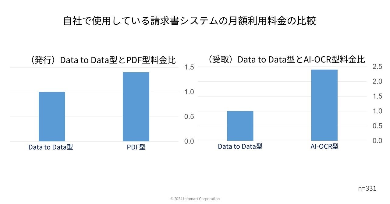 「Data to Data型」、「PDF型」、「AI-OCR型」で比較を行い、「Data to Data型」を1とした相対的な値で比べた結果、「PDF型」が1.4、「AI-OCR型」が2.4となり、「Data to Data型」の月額利用料金が最も低いことがわかりました。