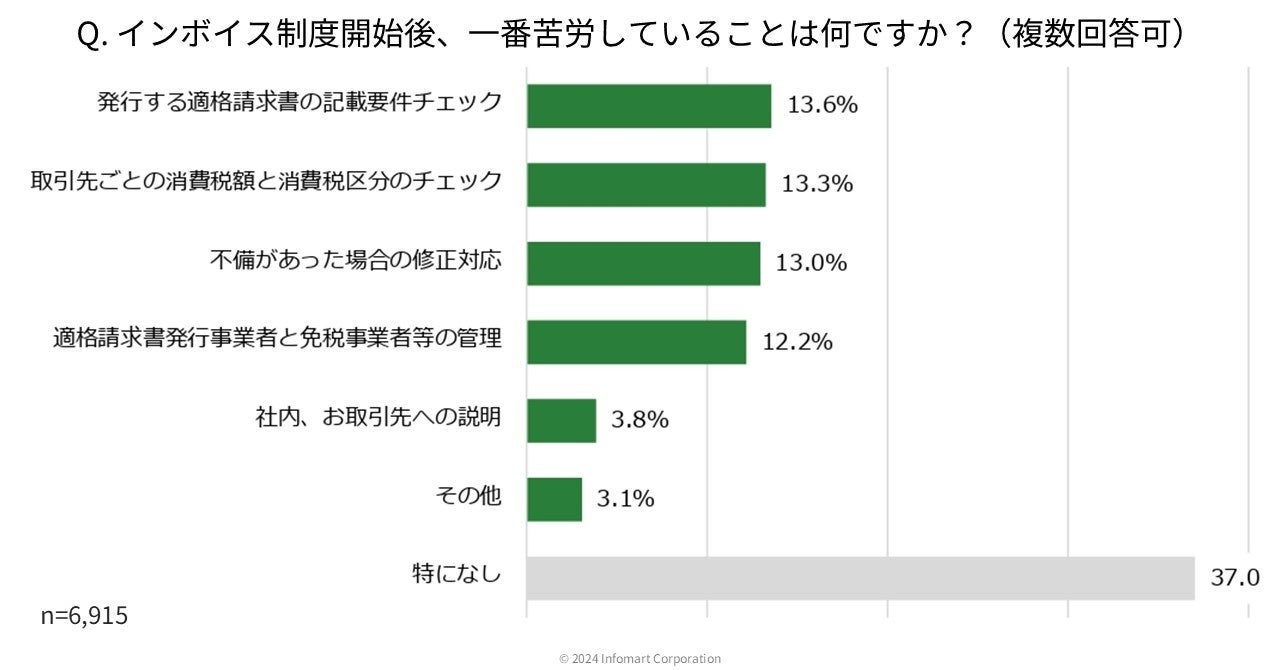 インボイス制度の開始後、一番苦労していることを聞いたところ(n=6,915)、一番多かったのは「発行する適格請求書の記載要件チェック」で13.6%でした。次いで、「取引先ごとの消費税額と消費税区分のチェック」が13.3%、「不備があった場合の修正対応」が13.0%と続きました。