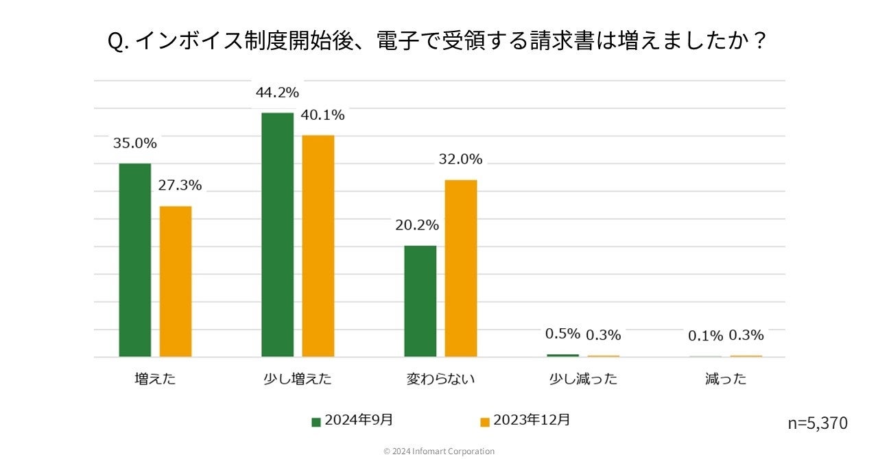 インボイス制度開始後、電子でやり取りする請求書は発行で5割以上、受け取りでは約8割が「増えた」