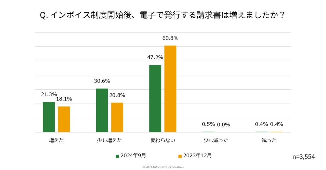 ・インボイス制度開始後、電子でやり取りする請求書は発行で5割以上、受け取りでは約8割が「増えた」