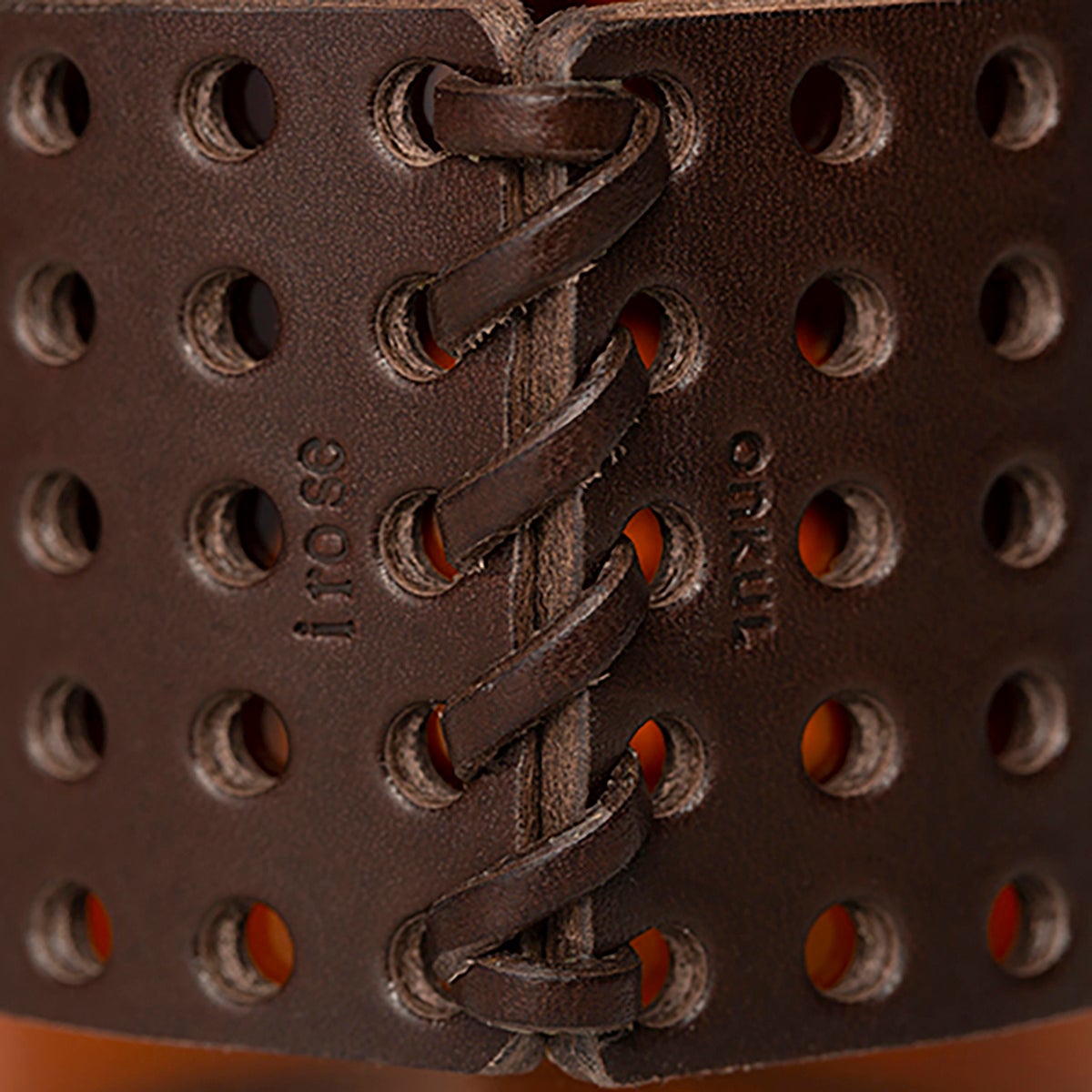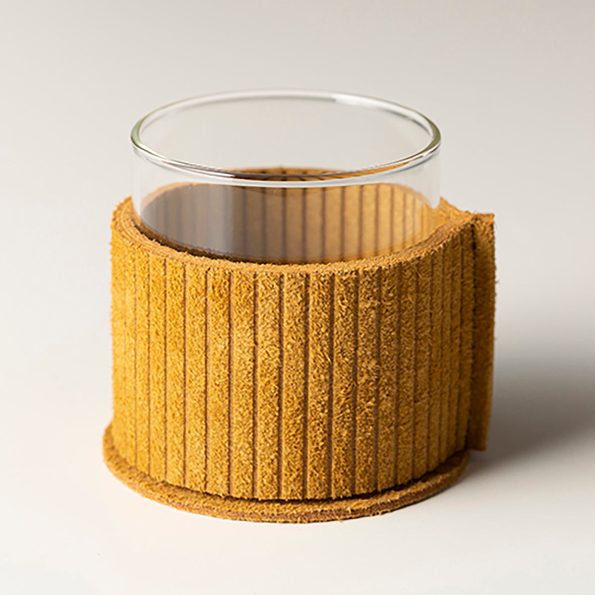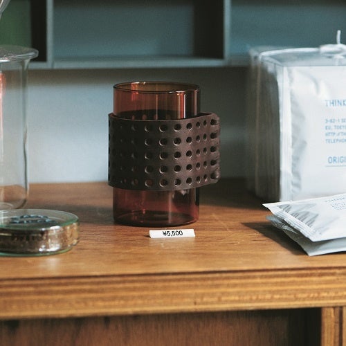 アンティークのような雰囲気のあるアンバーが目を惹く《ヴィジョングラス》の耐熱グラスに、ベジタブルタンニン加工のレザーハンドルを付けました。パンチング加工した穴に革紐をかがって取り付けられていて、幾何学的な雰囲気が渋い逸品。こちらも「onKuL」の刻印入りです。ホットドリンクをグラスで飲みたいあなたに。