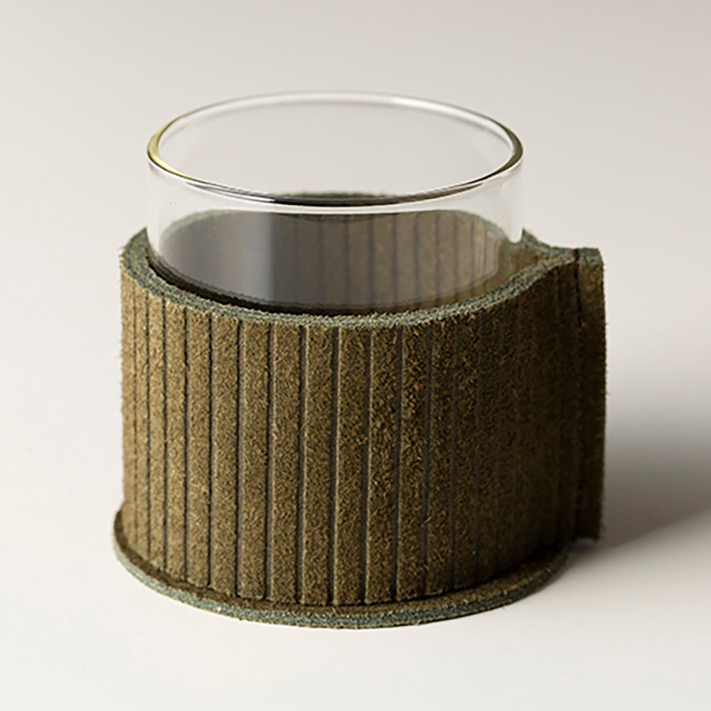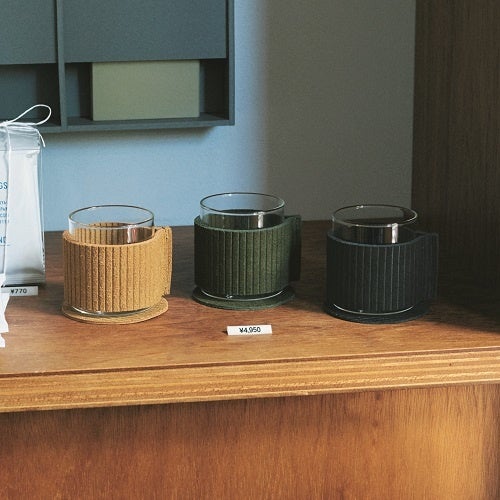革小物ブランド《イロセ》とガラスウェアメーカー《ヴィジョングラス》、そしてのトリプルコラボレートが実現!耐熱グラスにニットのリブをイメージしたストライプ柄の型押しスエードを2枚張り合わせ、ぐるりとあしらってマグに仕立てました。同素材のコースターの表面には「onKuL」ロゴを小さく刻印しています。ベージュ・カーキ・ブラックの3色展開。