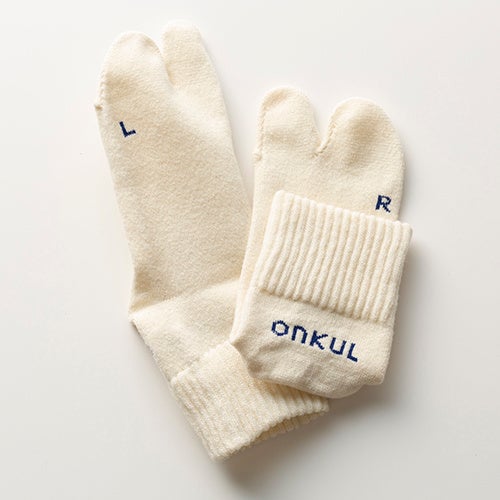 回収された製品や端切れを国内でリサイクルした素材をベースにしてつくる足袋型ソックス《アミタビ》。今回、onKULとコラボレートしたソックスが誕生しました!製糸業が盛んな長野県で70年以上も繊維の製造に加え、ニットや手袋、医療用品までも開発から生産を一貫して行う老舗メーカーにお任せした間違いない品です。《アミタビ》さんと靴下マニアの編集部員で履き心地に存分にこだわって作りました。