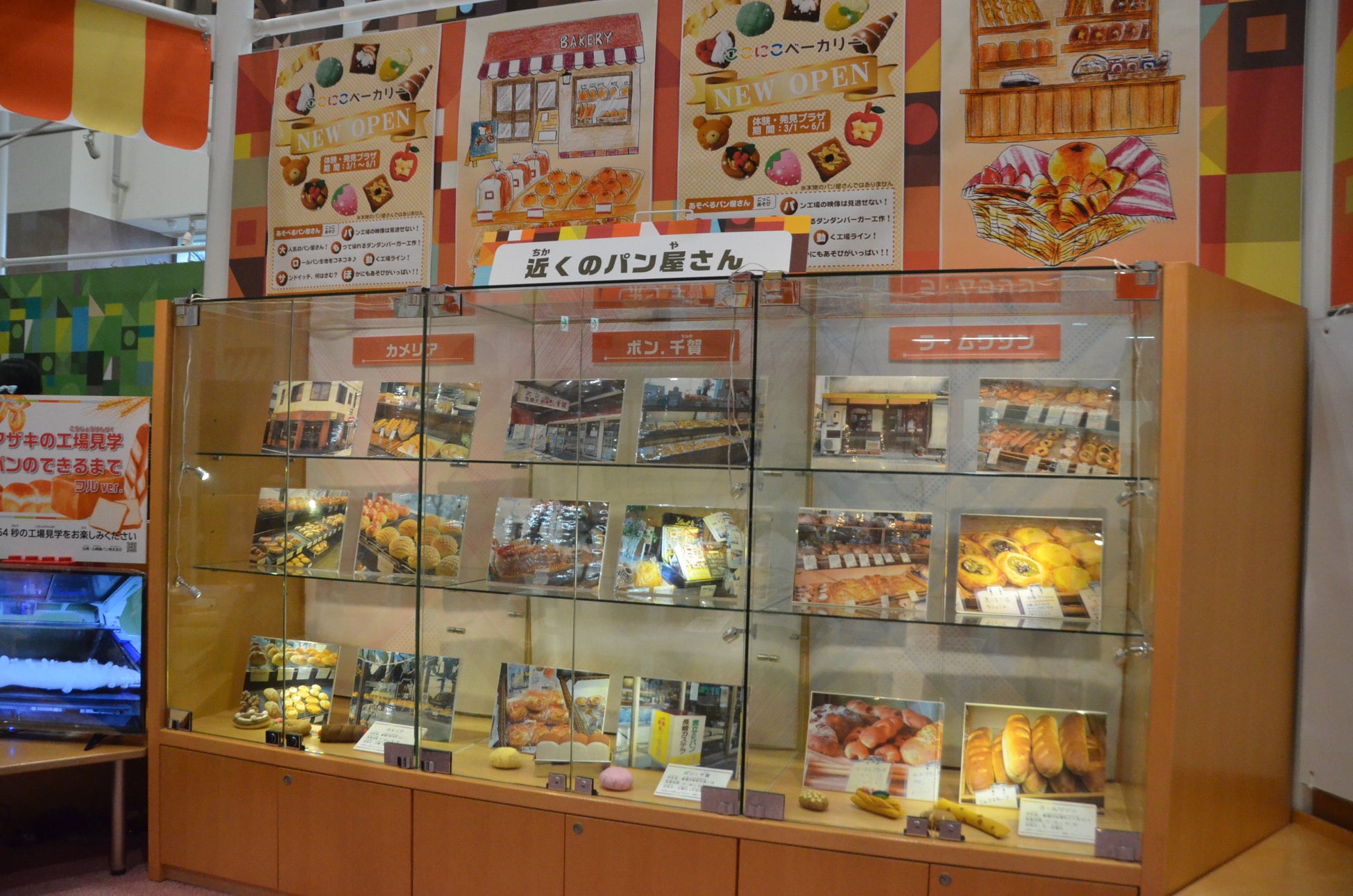 また「パン工場」と題し、見たり、遊んだりしながらパンができるまでを学べます。山崎製パン(株)の協力でパン工場の動画が流れているほか、パンや学校給食の団体の協力でパンの栄養、学校給食のパンの種類などについて知ることもできます。製造工程の一部を模造した「動く工場ライン」もあり、こどもたちが本物そっくりなパンをラインに載せて遊んでいます。