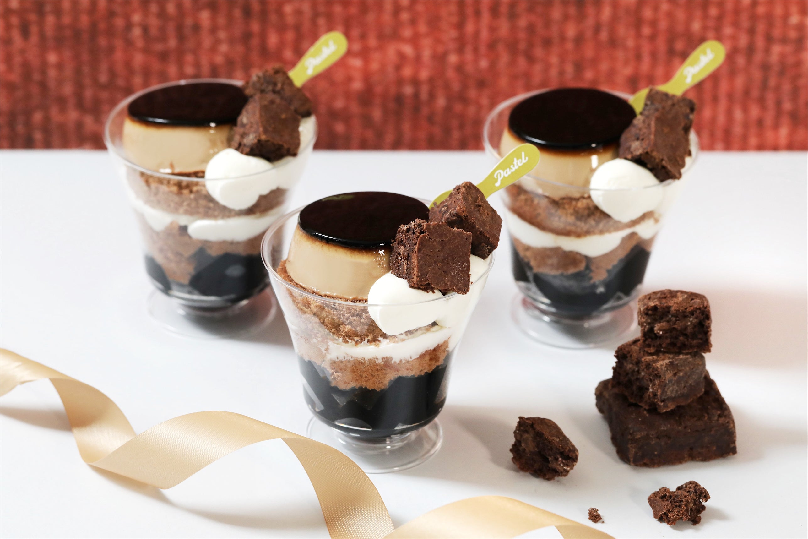 - パステルで人気の炭焼コーヒーゼリーにココアスポンジとホイップクリームを重ねてなめらかチョコプリンを乗せて飾りつけました。まるでプリン ア・ラ・モードのような華やかな見た目とボリューム感をお楽しみいただけます。