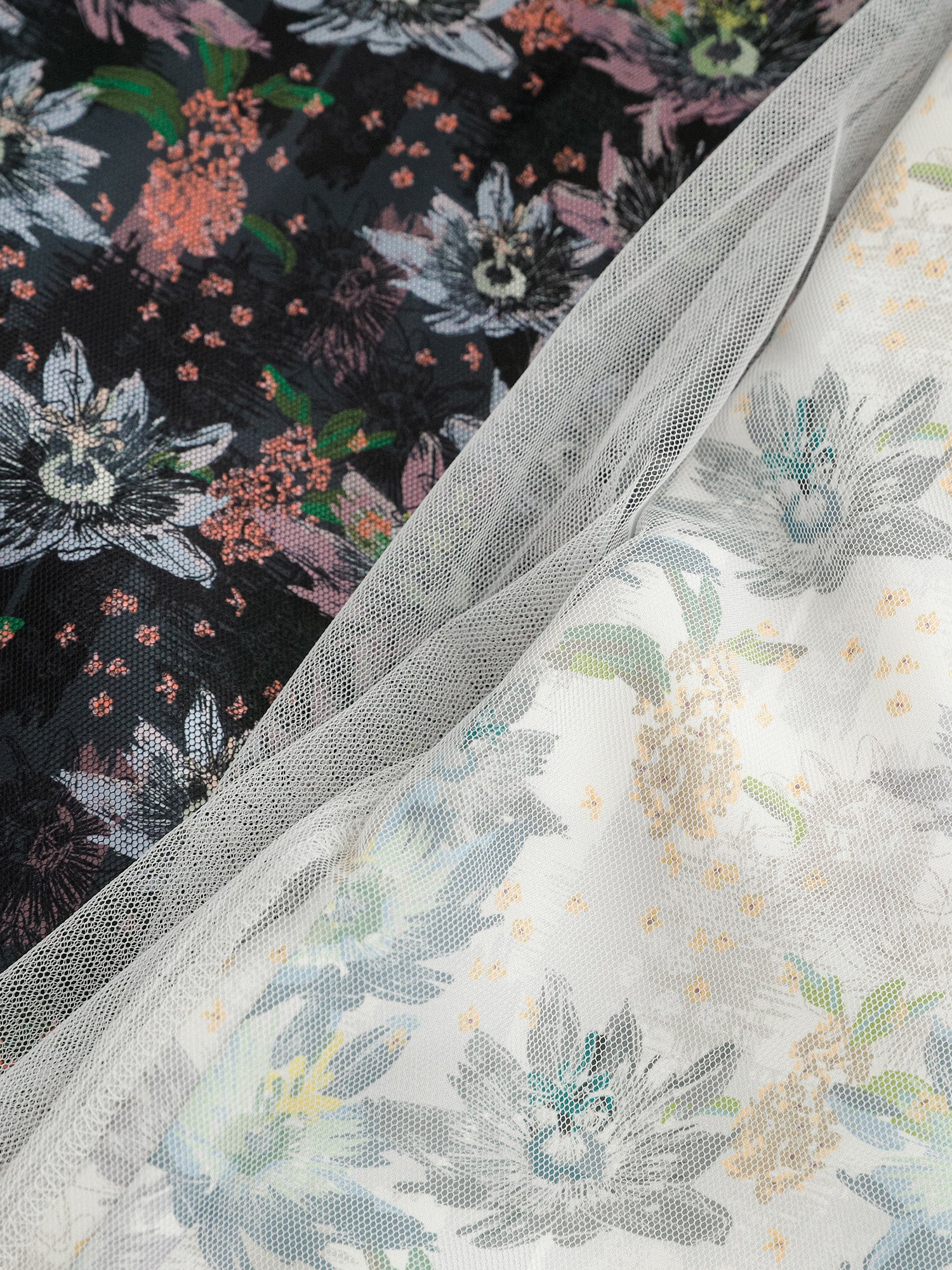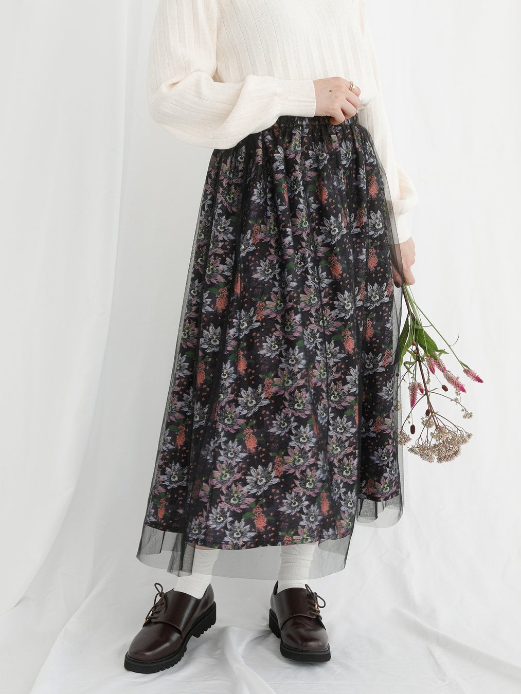 今年トレンドのチュールアイテムは、花柄プリントのスカートでご用意いたしました。イラストタッチの大きな花柄は、秋を感じるキンモクセイとトケイソウを散りばめた華やかな雰囲気のパターンを使用。シンプルなトップスに合わせるだけで、オシャレ度がアップするアイテムです。