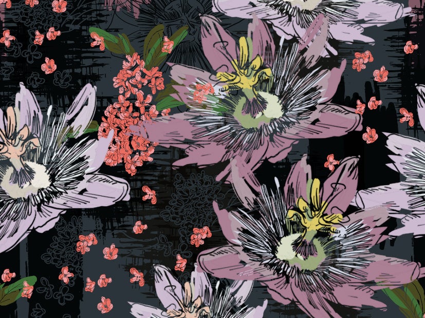 キンモクセイとトケイソウをちりばめた秋らしい華やかな雰囲気のパターンです。