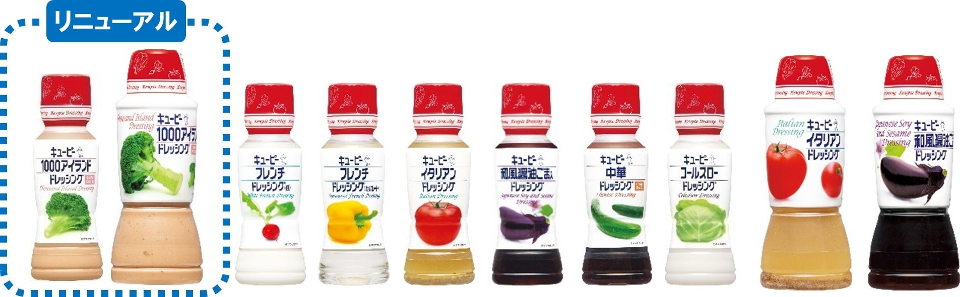 「キユーピー 1000アイランドドレッシング」は、1963年にキユーピーがフレンチドレッシング(赤・白)に次いで3番目に発売したドレッシングです。ピクルスの風味が楽しめるクリーミーな味わいで、現在では昔から親しまれている定番の赤キャップシリーズの中で売上構成比No.1のフレーバーです。幅広い世代のお客さまに支持されている一方で、長い間、味わいの変更をしていなかったため、嗜好の変化を踏まえ、リニューアルを行いました。