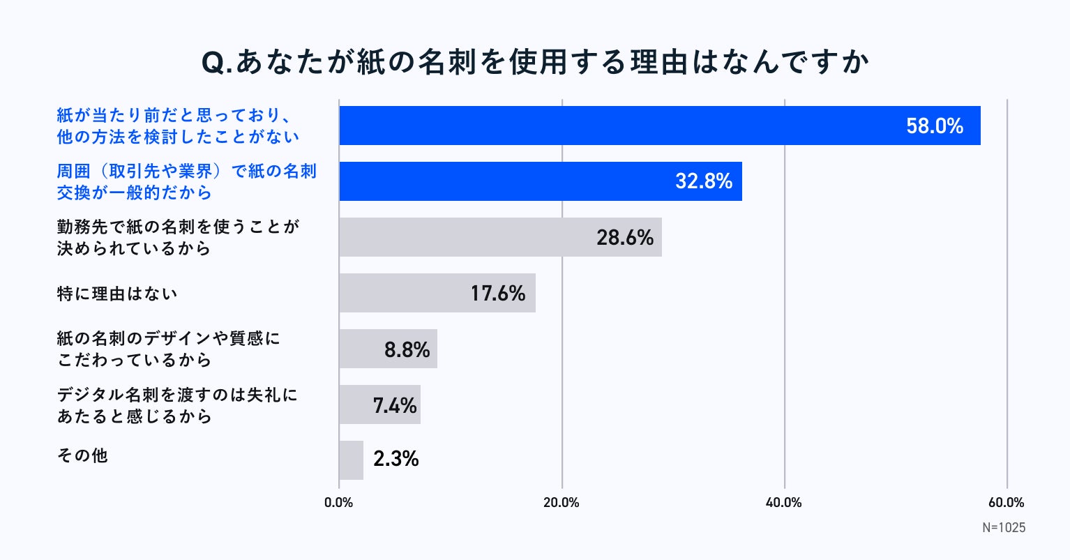 ・デジタル名刺ではなく紙を使用する理由は、「紙が当たり前だと思っており、他の方法を検討したことがない」