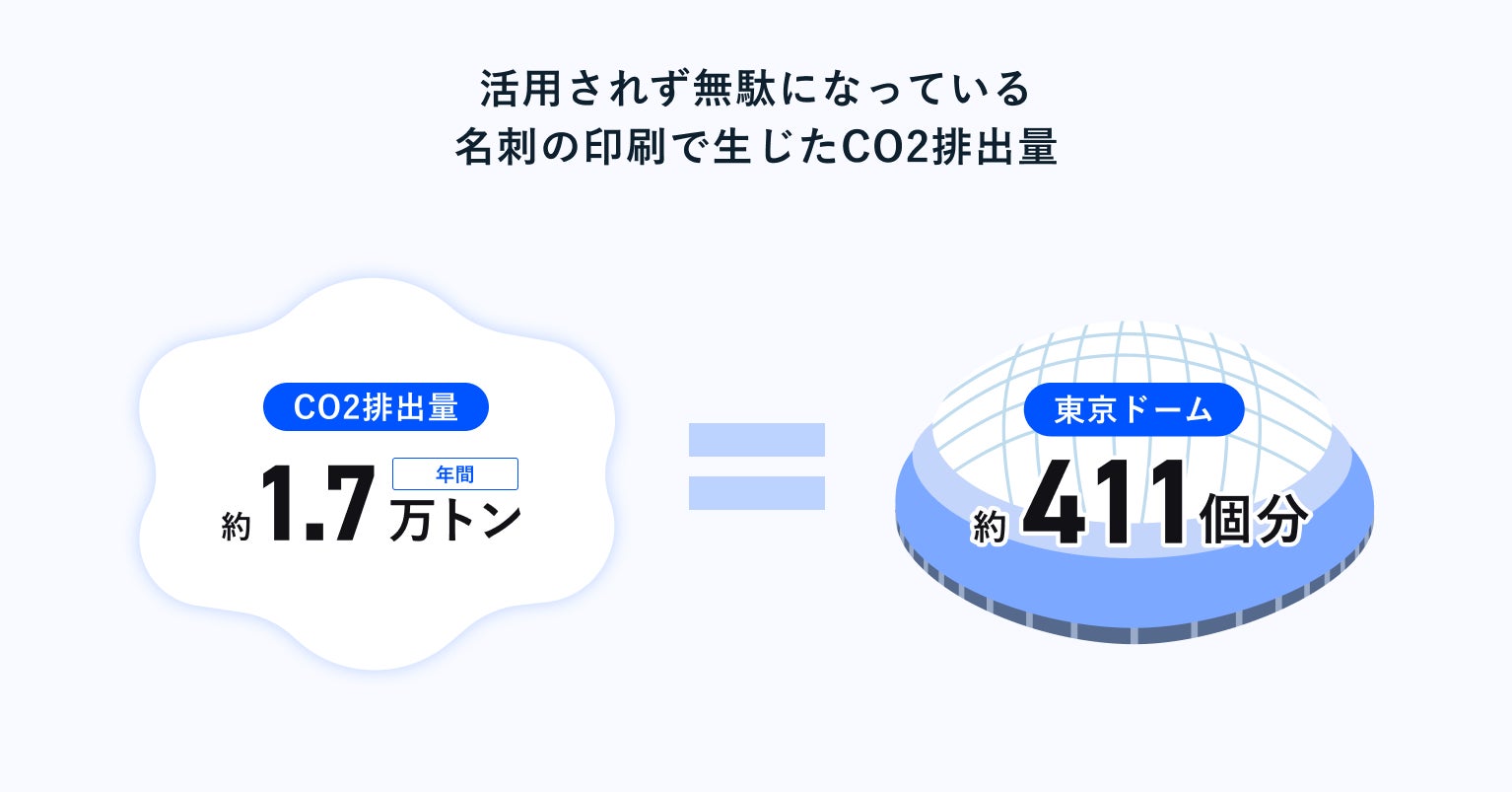 活用されていない名刺の印刷に伴い発生するCO2排出量は年間1.7万トンにのぼり、東京ドームおよそ411個分の森林が1年間に吸収する量に相当(※1)することが判明しました。