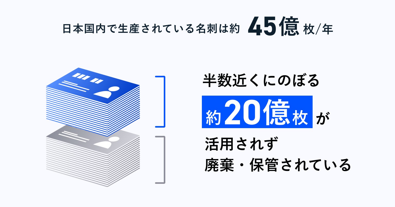 ・日本国内で生産される紙の名刺は年間およそ45億枚。そのうち半数近くが活用されずに廃棄・保管されている