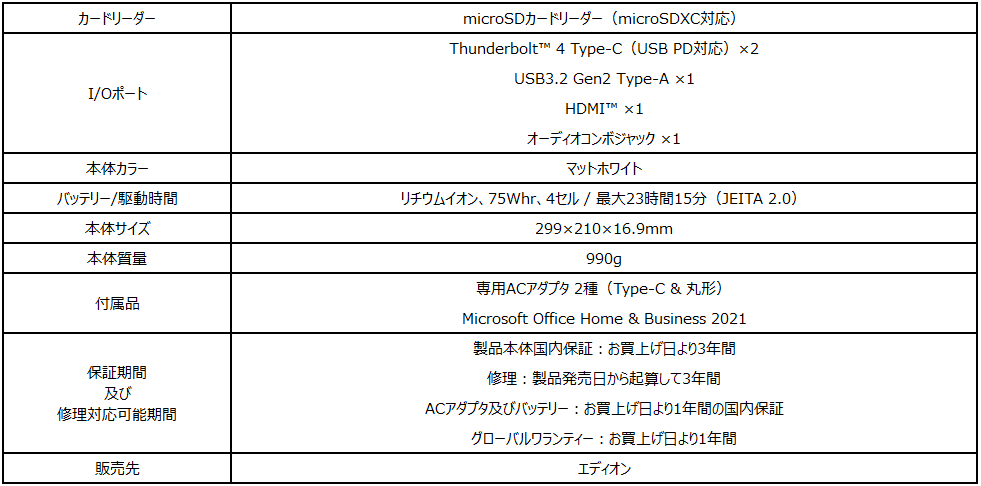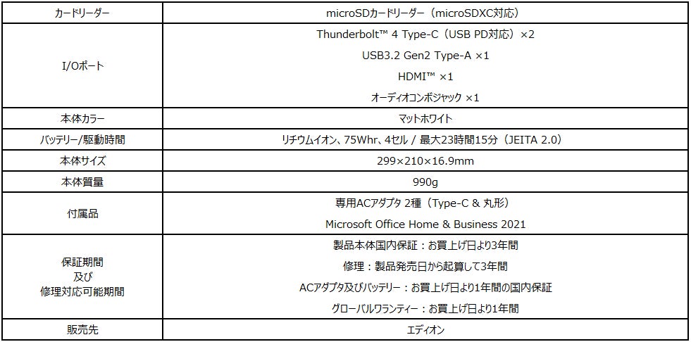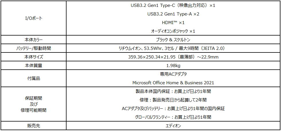 エディオンオリジナルモデルでは、通常の付属品となる2種類のACアダプタ(丸形・Type-C)に加え、文書作成・表計算・プレゼンテーション作成で欠かすことのできないオフィスソフト「Microsoft Office Home & Business 2021」が標準で付属。永久ライセンス版なので期間を気にすることなくご使用いただけます。また、3年間の長期メーカー保証が付帯しているため、安心してご使用いただけます。