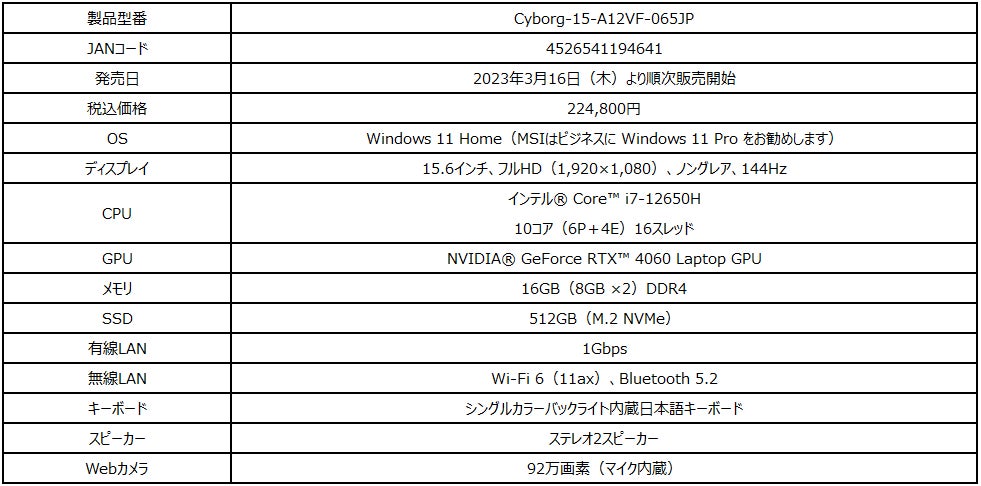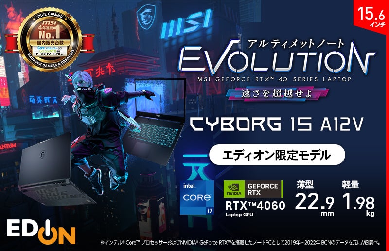 この度、エムエスアイコンピュータージャパン株式会社は、サイバーパンクの世界にインスパイアされたスケルトンデザインを採用した薄型・軽量ゲーミングノートPCのエディオン限定モデル「Cyborg-15-A12VF-065JP」を2023年3月16日(木)より発売いたします。