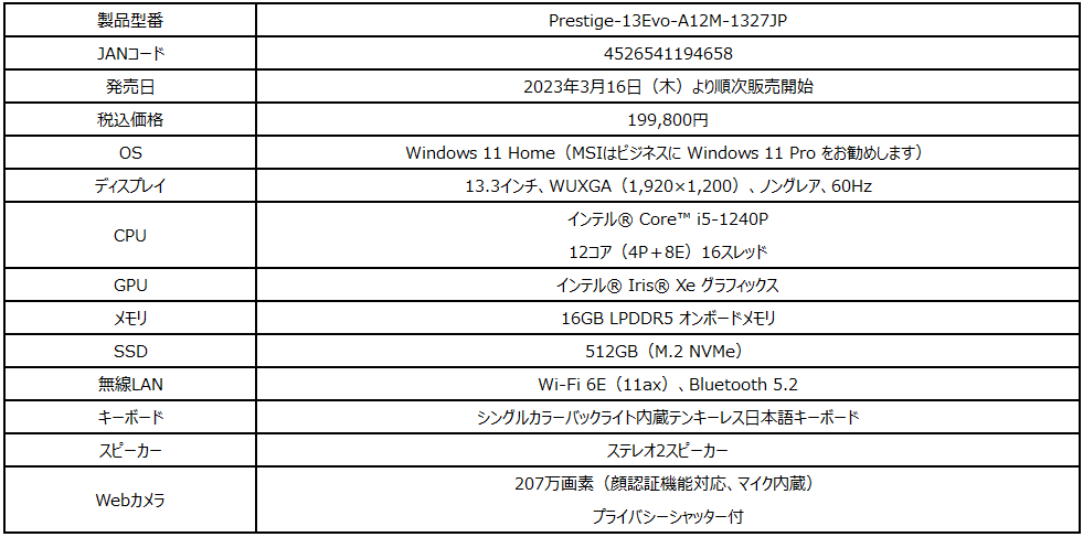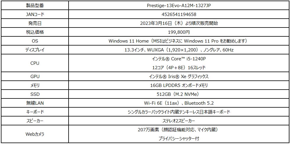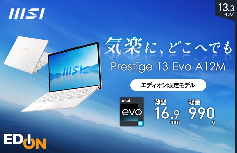 また、MSIノートPC史上初となる軽さ1kg以下の超軽量デザインのビジネスノートPC「Prestige 13 Evo A12M」エディオン限定モデル「Prestige-13Evo-A12M-1327JP」も同時発売いたします。