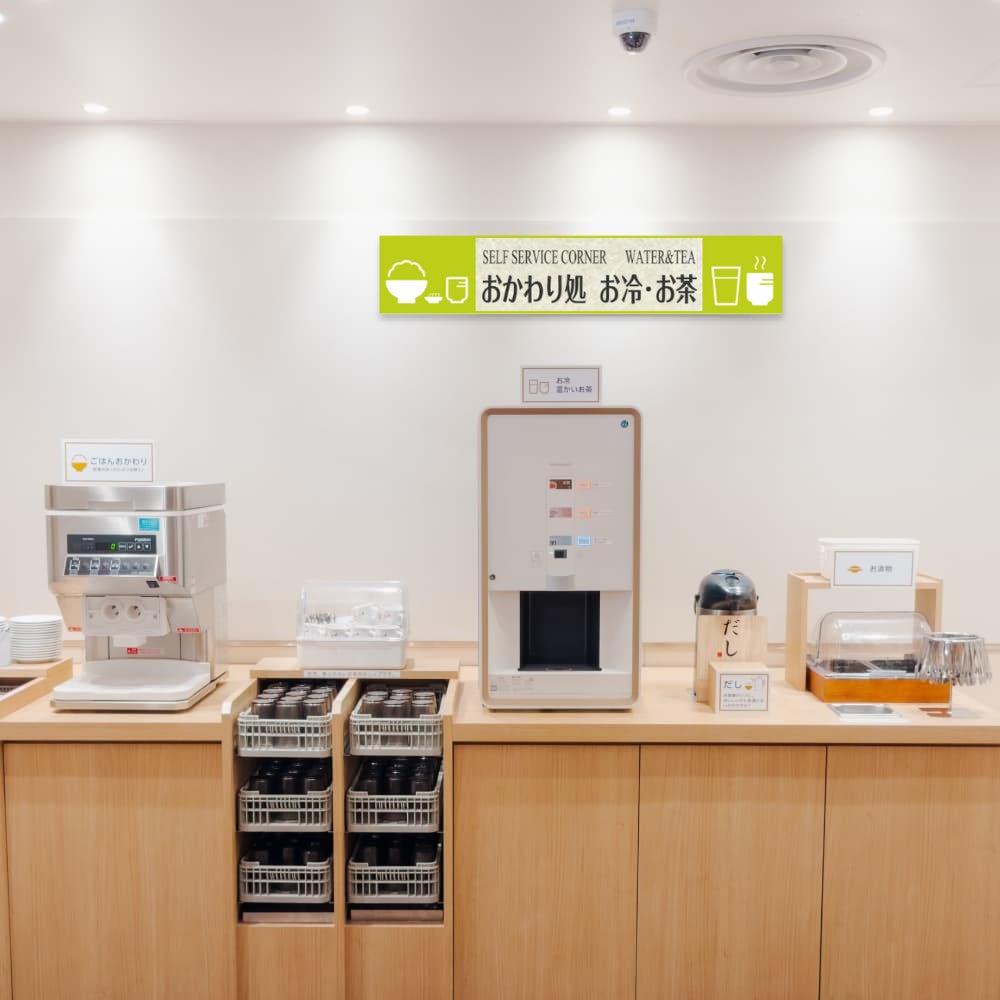 「やよい軒」といえば!『おかわり処』何度でもおかわり自由!!ごはん(金芽米) ・だしサービス・お漬物・お冷・ほうじ茶