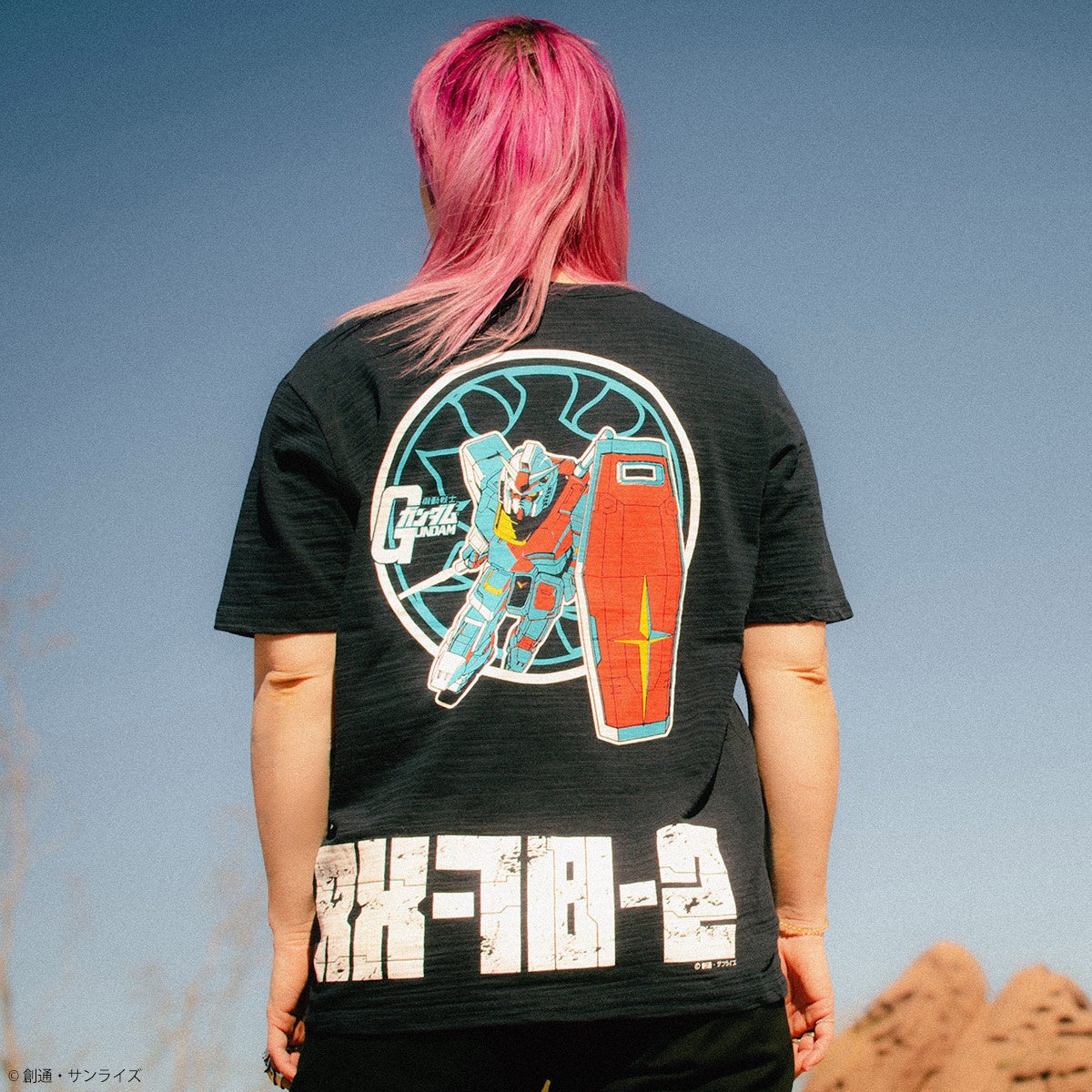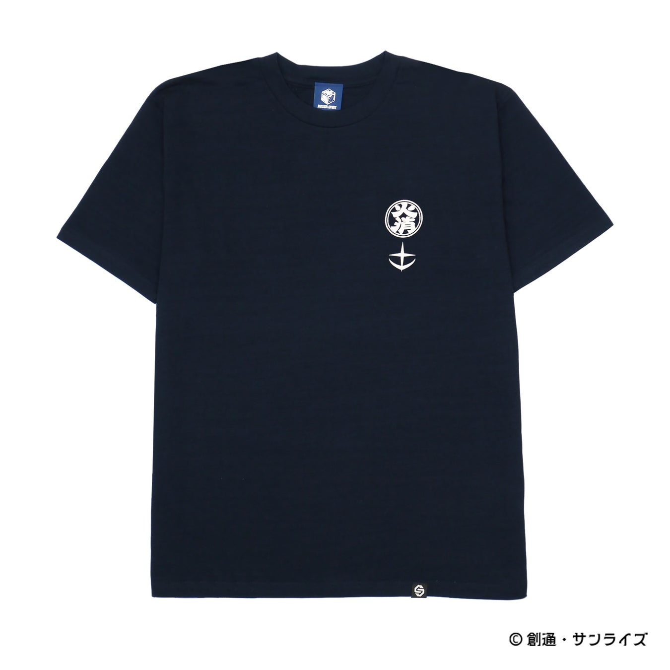 「RX-78-2 ガンダム」、「MS-06S シャア専用ザクⅡ」を火消魂の半纏マナーによるデザインに落とし込み、抜色剤を含んだ糊を印捺し脱色する伝統的な技術、抜染加工を用いて、通常のプリントでは出せない独特な風合いに仕上げたTシャツです。独特の表情を持つスラブ素材(太さ・形・長さなど不規則なスラブ糸を編んで織られ、凸凹のあるテクスチャーを加えた生地)を使用しています。