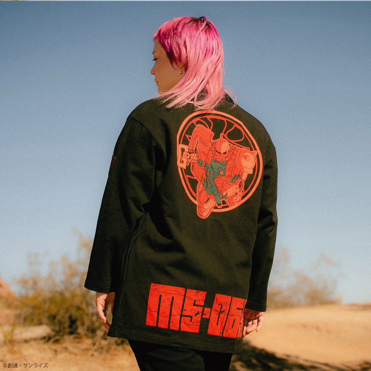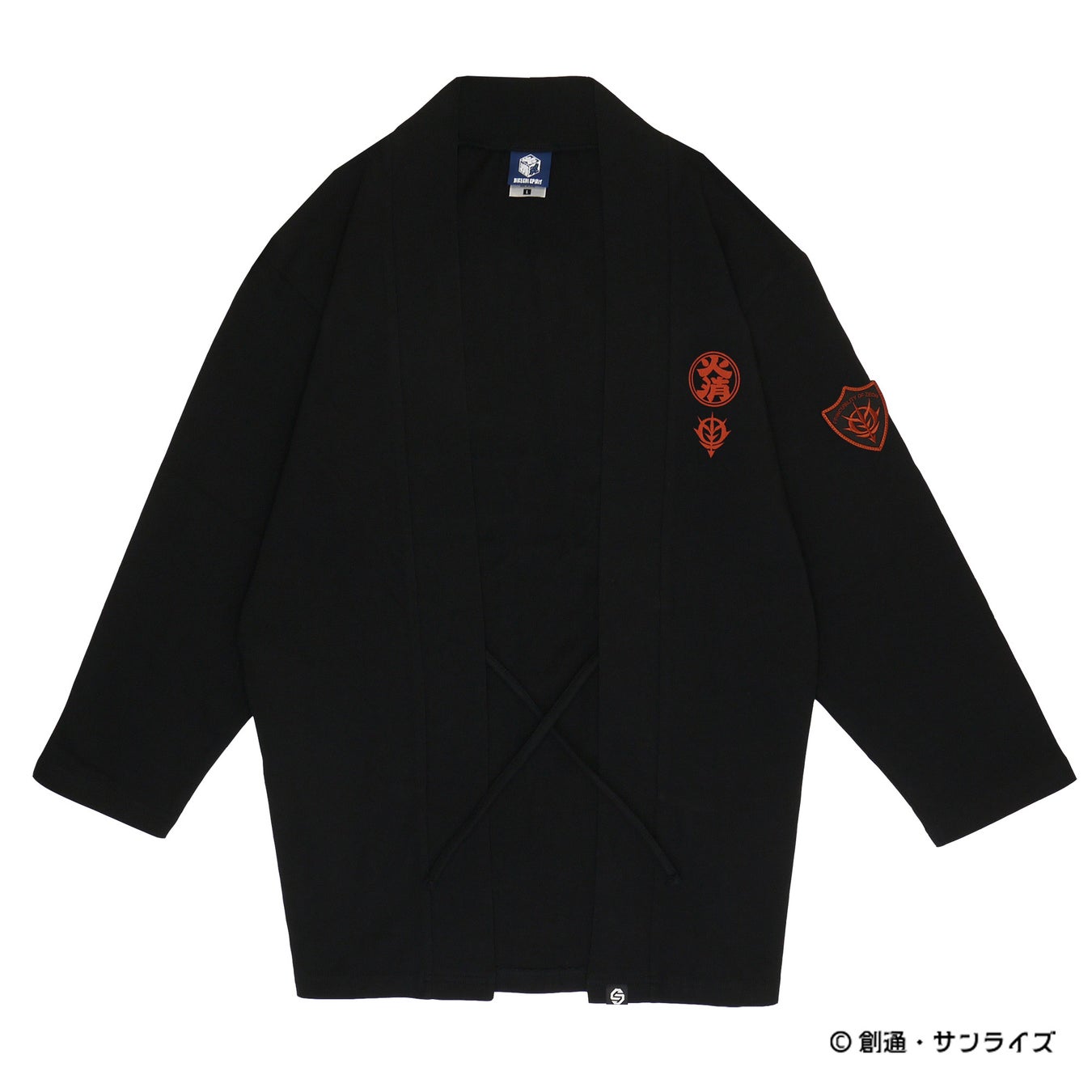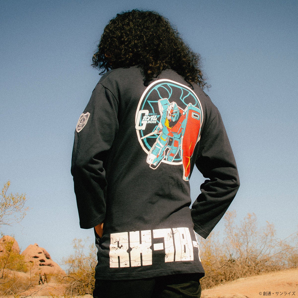 火消魂を代表するアイテム「半纏」をベースに、「RX-78-2 ガンダム」、「MS-06S シャア専用ザクⅡ」を半纏マナーによるデザインに落とし込み、抜色剤を含んだ糊を印捺し脱色する伝統的な技術、抜染加工を用いて、通常のプリントでは出せない独特な風合いに仕上げた、火消魂オリジナルカットソーHANTEN。現代でも纏える和服をコンセプトに、袖は細身にシェイプし、再構築しています。