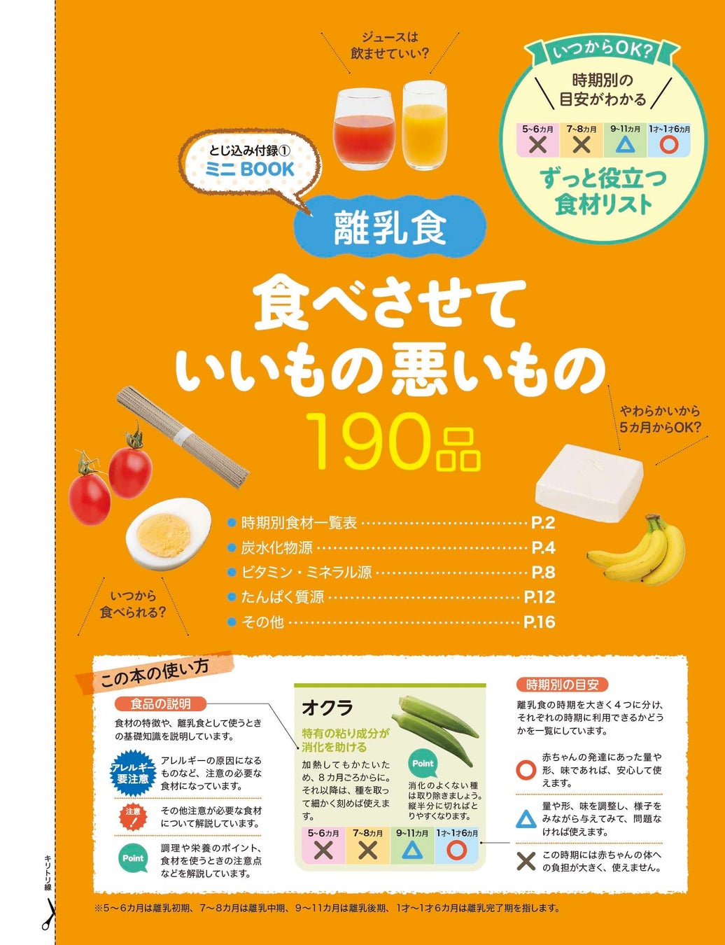 2大付録つき! ミニブック「食べさせていいもの悪いもの」と、シート「離乳食の進め方早見表」&「離乳食の基本調理法」。