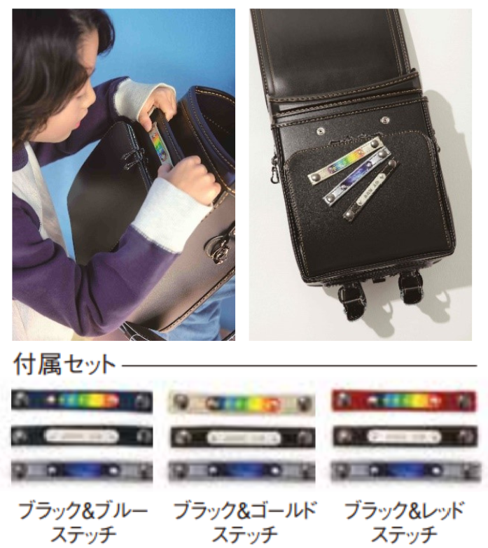 男の子に人気のカラー「ブラック」モデルのランドセルに、付け替えできるデザインプレートを新たに付属。6年間飽きずに使えるシンプルでスタイリッシュなデザインです。「ネームプレート」(1種)と、「サンダー(雷)をテーマにしたプレート」(2種)の、計3本のプレート付き。プレートは取り付け・取り外しも簡単な仕様です。「クラリーノ® タフロック® NEO」(傷に強い人口皮革の素材)を使用することで、耐久性と軽量化にもこだわっています。成長に合わせて下ベルト幅が左右に広がる「ミラくるっロック」を採用しているので、お子さまの身長の変化にあわせて長くご愛用いただけます。