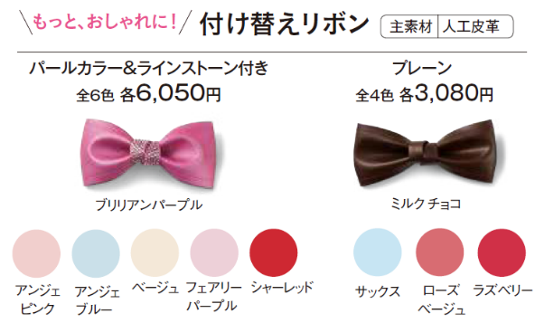 かぶせの大きなリボンが可愛いアクセント。「リボン」と「鋲」で、もっとおしゃれにカスタイマイズが楽しめます。リボンと鋲は、お好きなカラーでの組み合せが可能。取り付け・取り外しも簡単な仕様です。さらに、体にやさしい「ふわりぃ背カン」を搭載して体感重量軽減も追求しました。※リボンは、別売りも有。