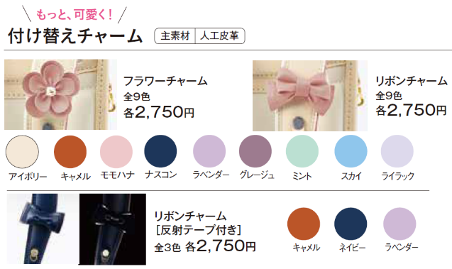 「リボンチャーム」 全9色 各2,750円 「リボンチャーム」(反射テープ付き) 全3色 2,750円