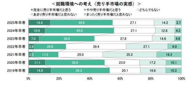 ○売り手市場だと感じる学生は全体の半数強(55.0%)。コロナ禍前と同水準