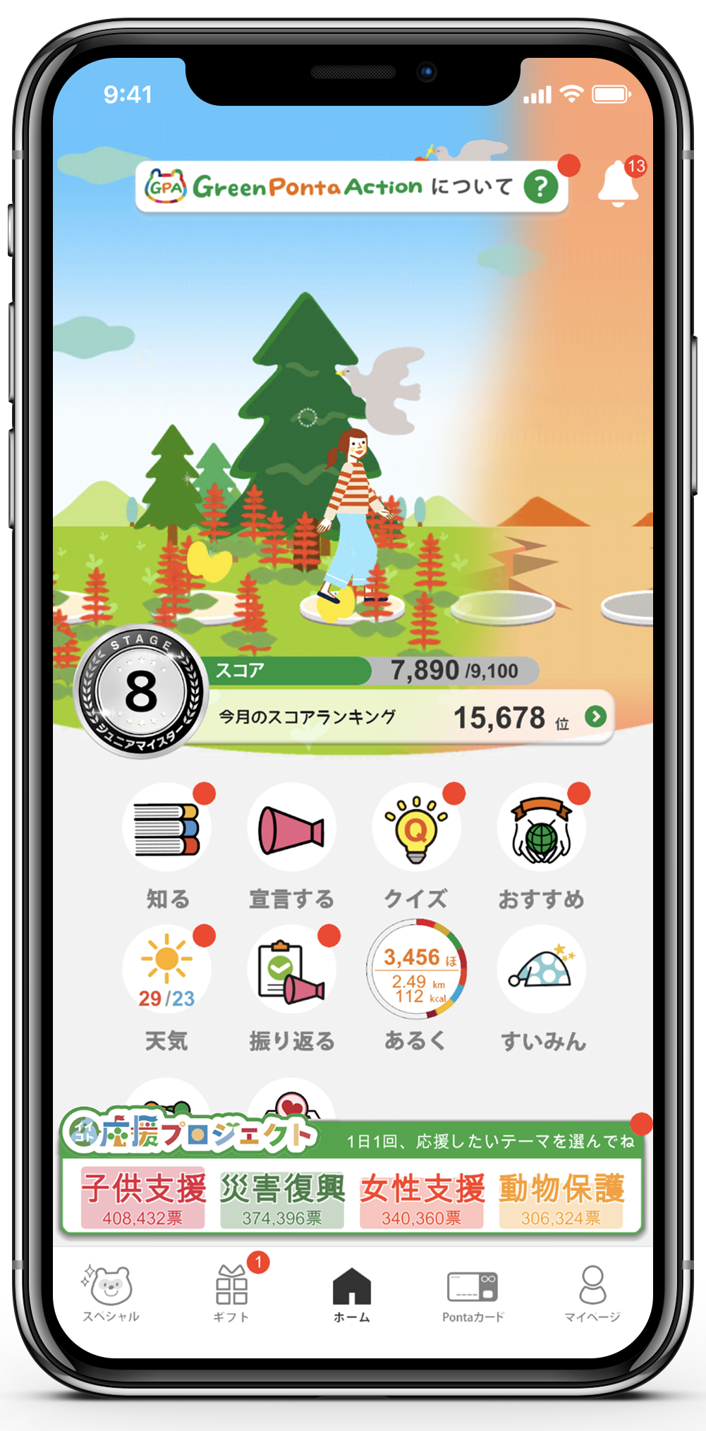 Green Ponta Actionは、「今日することで、未来を変えてゆく」をコンセプトに、日常生活の中で気軽に取り組めるアクションを積み重ねることで、持続可能な未来に向けた活動を応援できるスマートフォンアプリです。ステージに応じて、Pontaポイントがたまる特典があります。