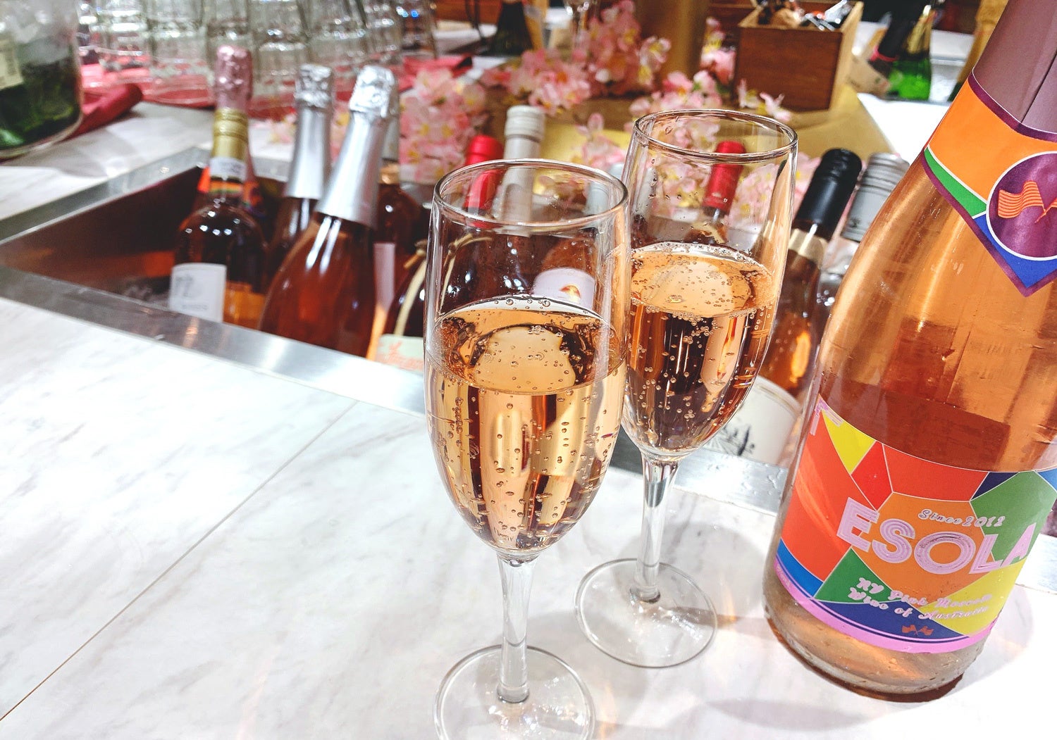 "桜フェア"期間中は、ロゼワインのコーナーを設置。可愛らしいピンク色や淡いオレンジ色のロゼワインは、お花見にピッタリ!日替わりで10種ほどご用意しておりますので、お料理に合わせてロゼワインをお選びいただけます。