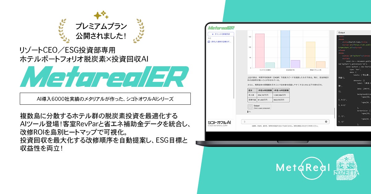 メタリアル・グループの株式会社ロゼッタ(代表取締役:五石 順一)は、ホテルポートフォリオ脱炭素×投資回収AIエージェント「Metareal エコリゾート」(以下、Metareal ER)のプレミアムプラン(⽉額5万円(税込)、1⽇20回・⽉200回利⽤可能)を2025年10⽉8⽇(水)より提供開始しました。