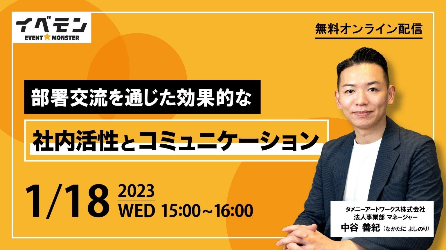 タメニー株式会社(本社:東京都品川区、代表取締役社長:栗沢研丞、証券コード:東証グロース6181)のグループ会社であるタメニーアートワークス株式会社(代表取締役社長:福井秀幸)が運営する企業イベントプロデュース「イベモン(URL:https://evemon.jp/」は、『部署交流を通じた効果的な社内活性とコミュニケーション』をテーマとした無料ウェビナーを1月18日(水)に開催いたしますのでお知らせいたします。